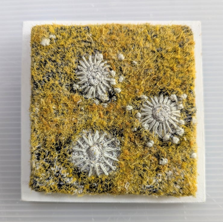 I create coastal inspired textures using a combination of embellishing and embroidery; blending a variety of recycled fabrics to create subtle variations in tone. These are stitched inside waste plastic to cast true to life pieces with cement giving a distinct contrast between the manmade structure of the packaging and the soft natural textures of the textiles.