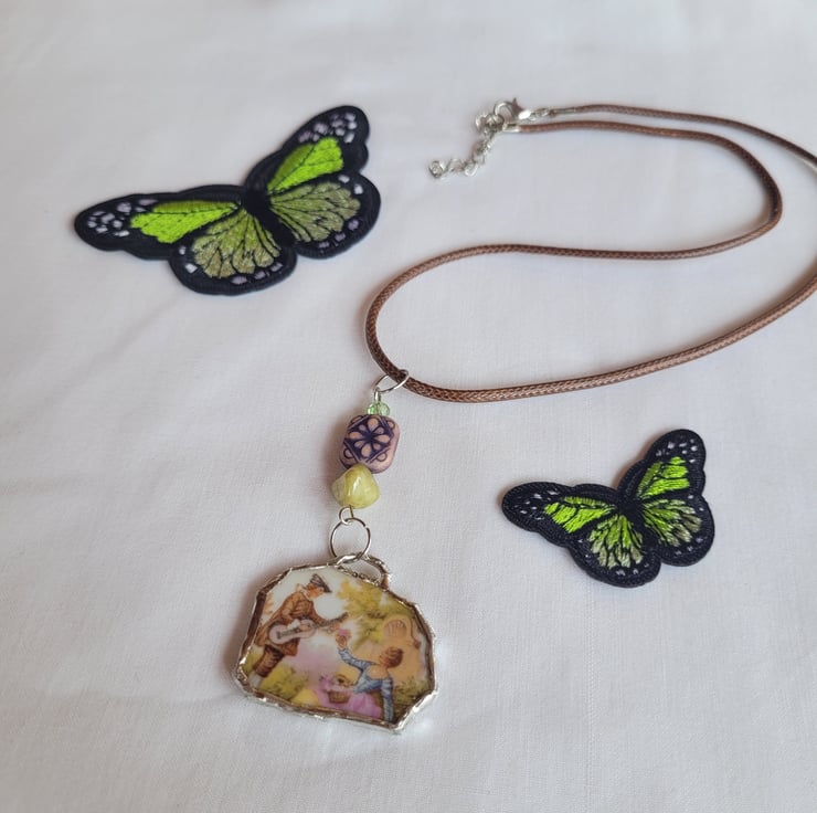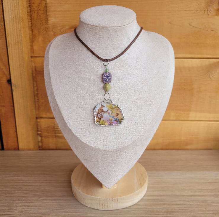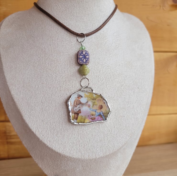 Upcycled Couple Ceramic Plate Necklace with Brown Cord.