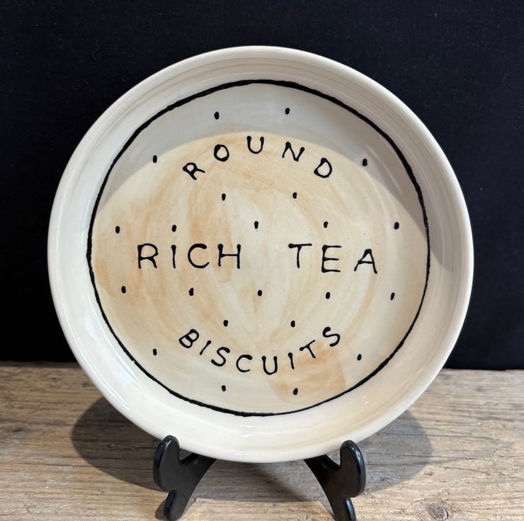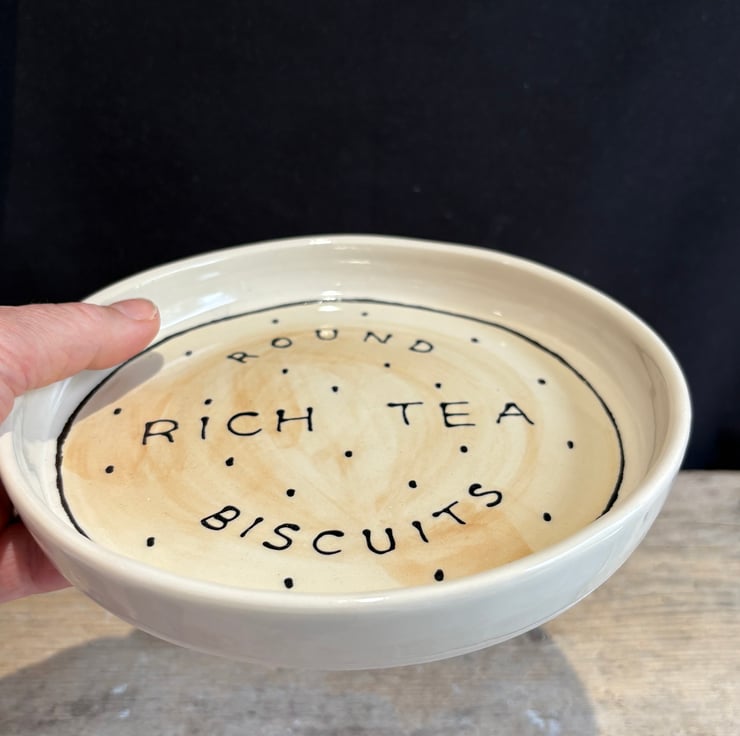 It has been thrown on the potters wheel and then hand painted with ceramic underglazes to look like a massive Rich Tea biscuit which makes for an eye-catching addition to your kitchen or dining table.