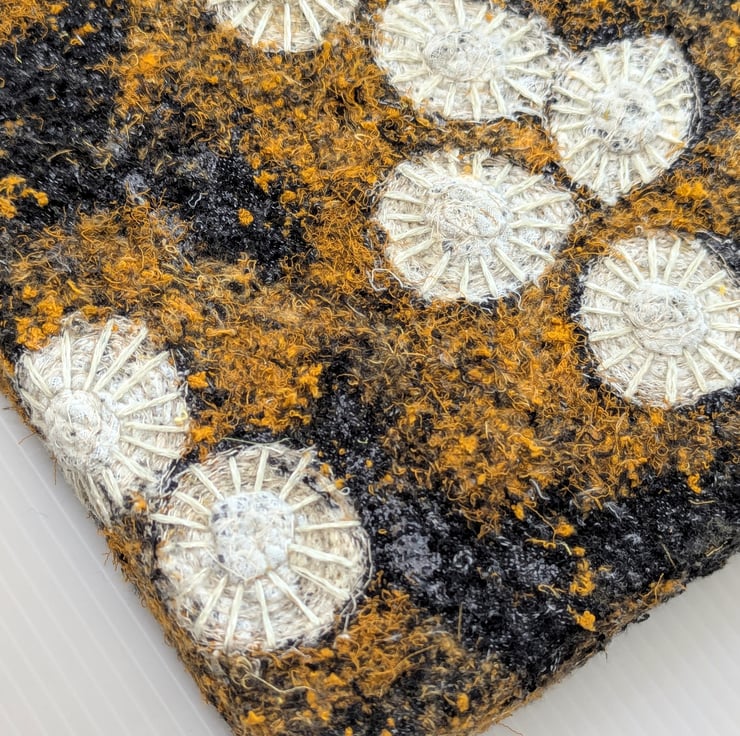 Unique piece of textile art, perfect for sea lovers. Recycled suit fabric embellished and embroidered with coastal inspired textures in a soft muted palette of warm terracotta/burnt orange tones with hand finished shell motifs.