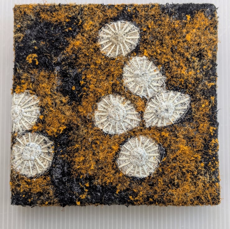 I create coastal inspired textures using a combination of embellishing and embroidery; blending a variety of recycled fabrics to create subtle variations in tone. These are stitched inside waste plastic to cast true to life pieces with cement giving a distinct contrast between the manmade structure of the packaging and the soft natural textures of the textiles.