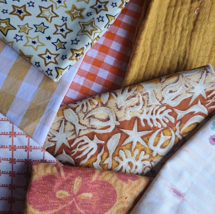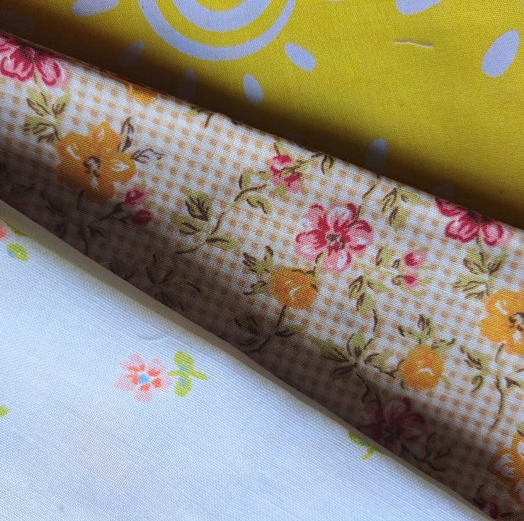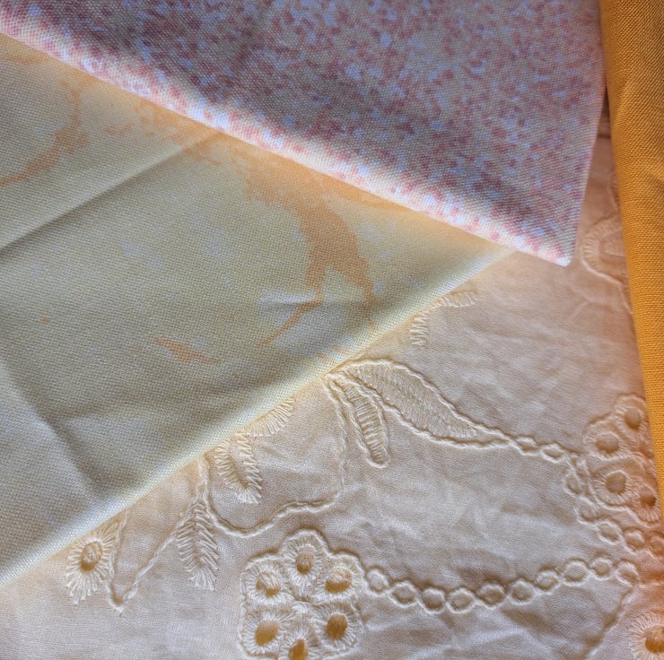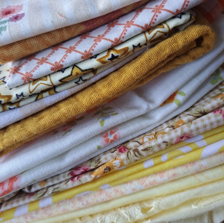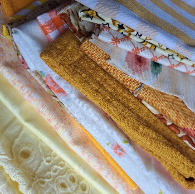 A beautiful big bundle of joyful yellows and oranges: Fifteen pieces of new, vintage, repurposed and remnant cotton fabrics, all in sunshine shades. The weights range from light shirting and quilting cotton to broderie Anglaise and a bit of furnishing fabric. Have yourself a bright, bright sunshiny day.