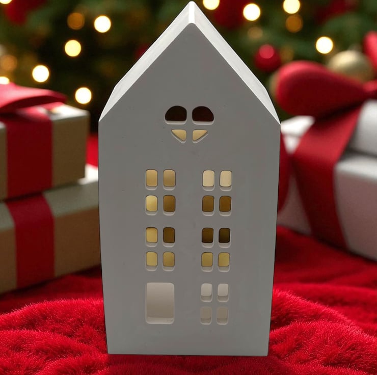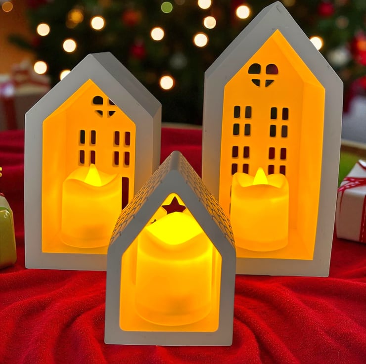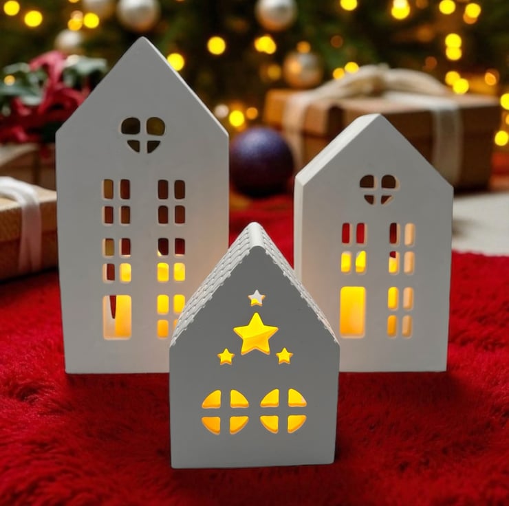 These white Christmas village houses are perfect for creating a cosy, glowing winter display. Each one has cut-out windows that shine beautifully when lit, making them ideal for festive mantel styling, Christmas shelf decor, or a charming handmade winter village. Their clean white finish suits modern, minimalist and Scandinavian-inspired interiors.