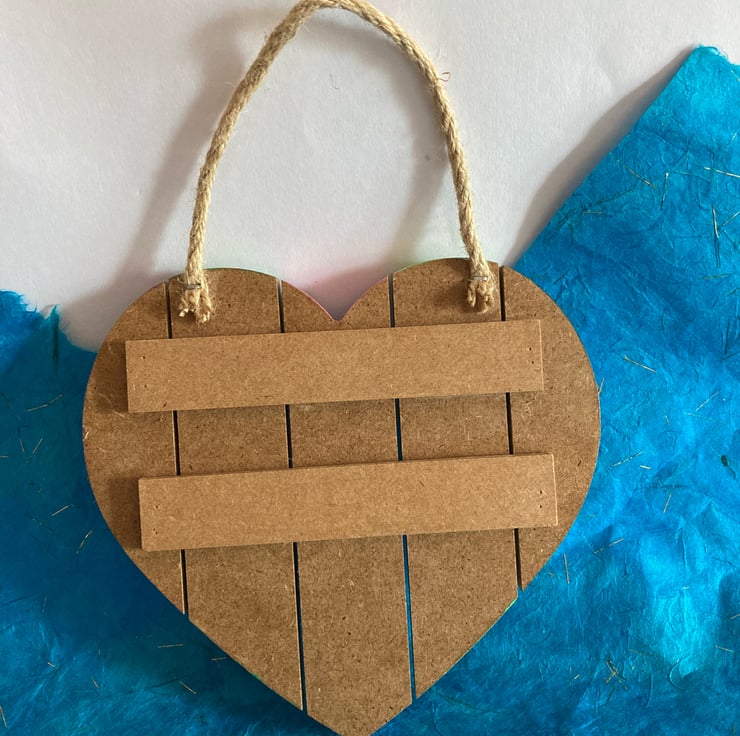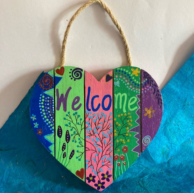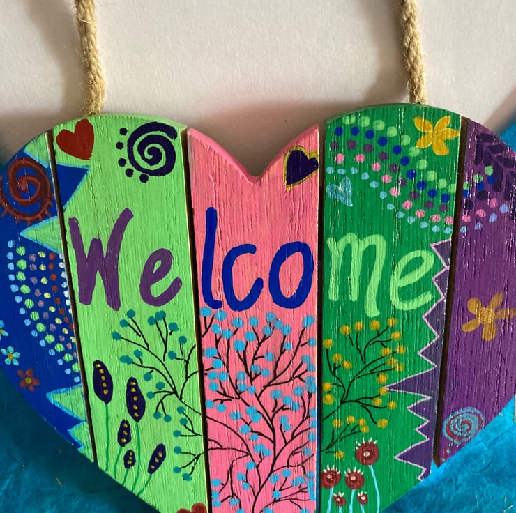 This is an up cycled hand painted heart shaped sign which hangs by a jute string. It is painted in a variety of colours with the word welcome written across the front.