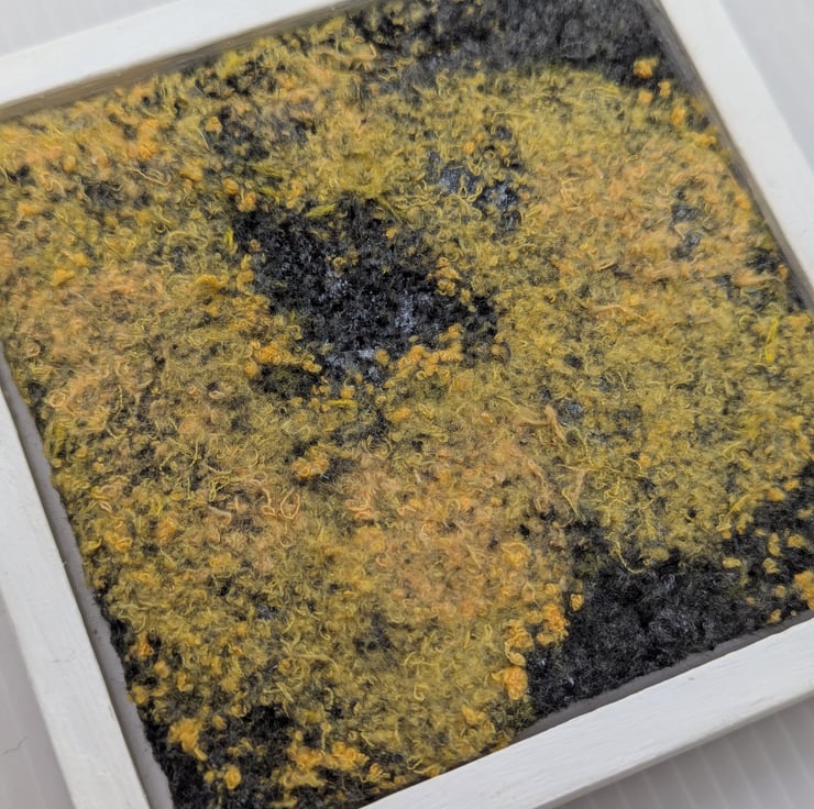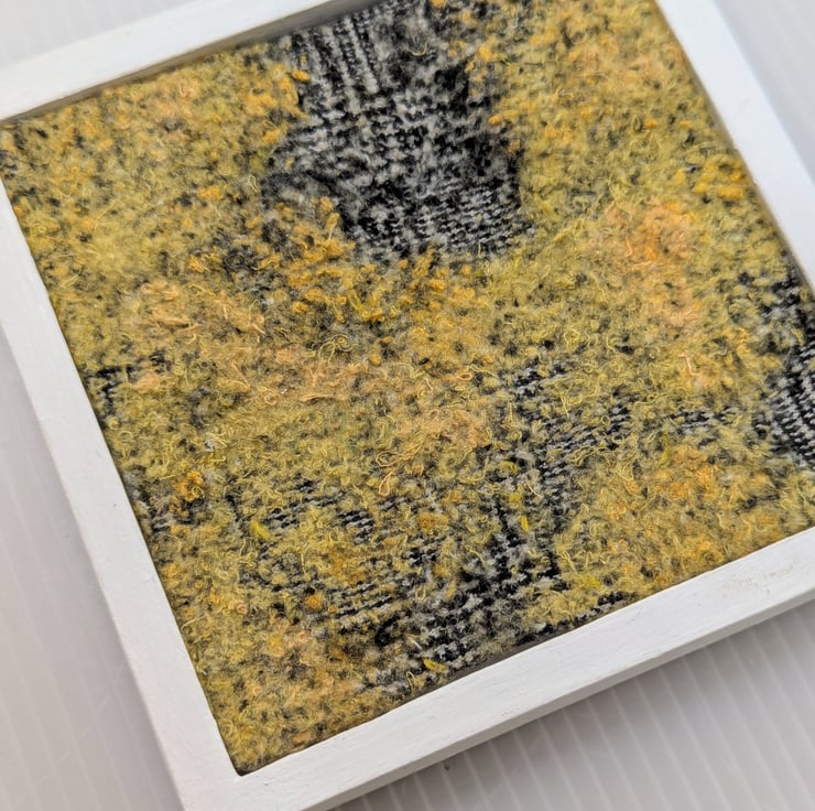 Unique piece of textile art, perfect for sea lovers. Recycled suit fabric embellished and embroidered with lichen inspired textures in a bold palette of yellow tones.