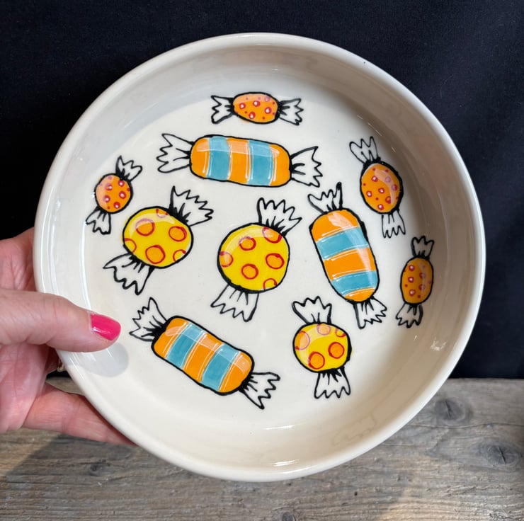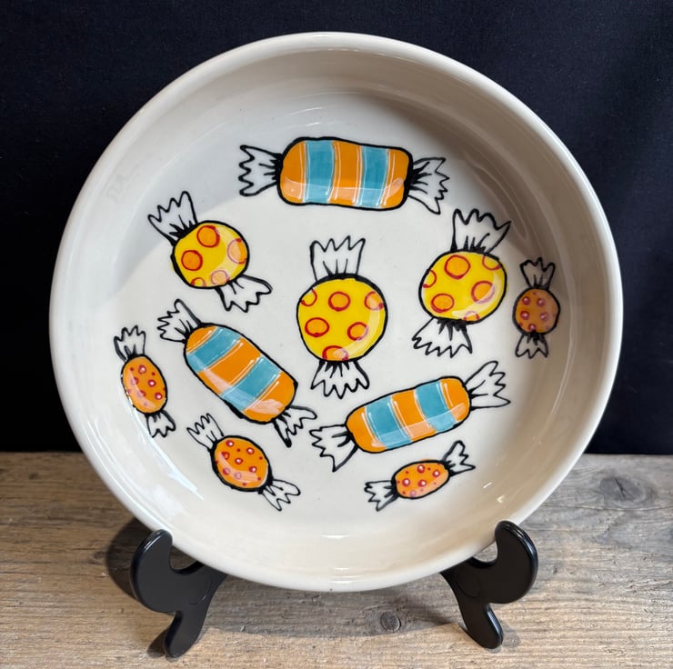 This plate has been thrown on the potters wheel and hand painted with sweets in bright colours. It is perfect for serving up your favourite sweets at a party or movie night.