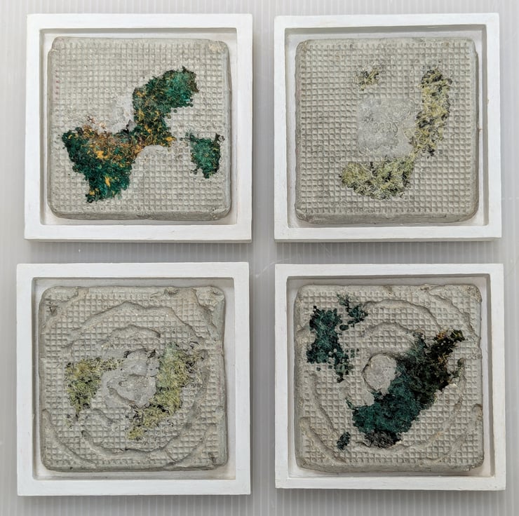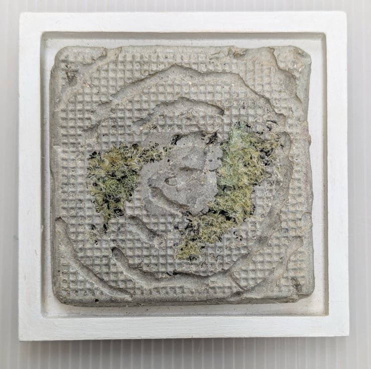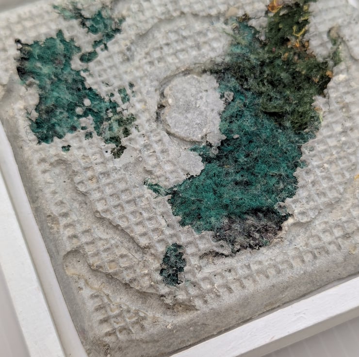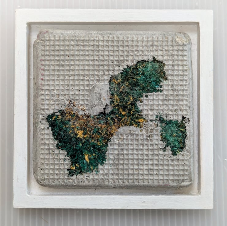 Unique piece of mixed media art, perfect for sea lovers and dreamers. Recycled suit fabric embellished with lichen inspired textures in a palette of green tones cast with concrete in textured waste plastic packaging.