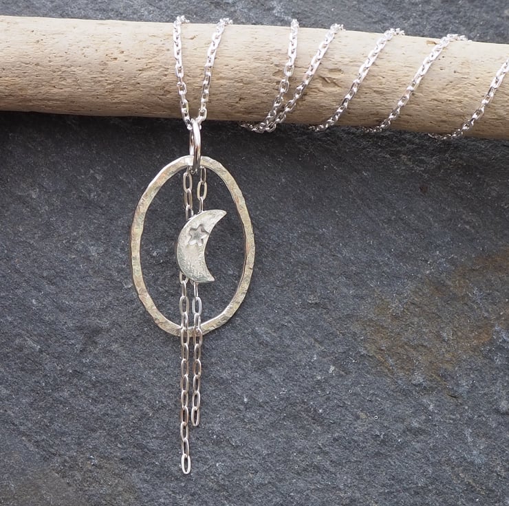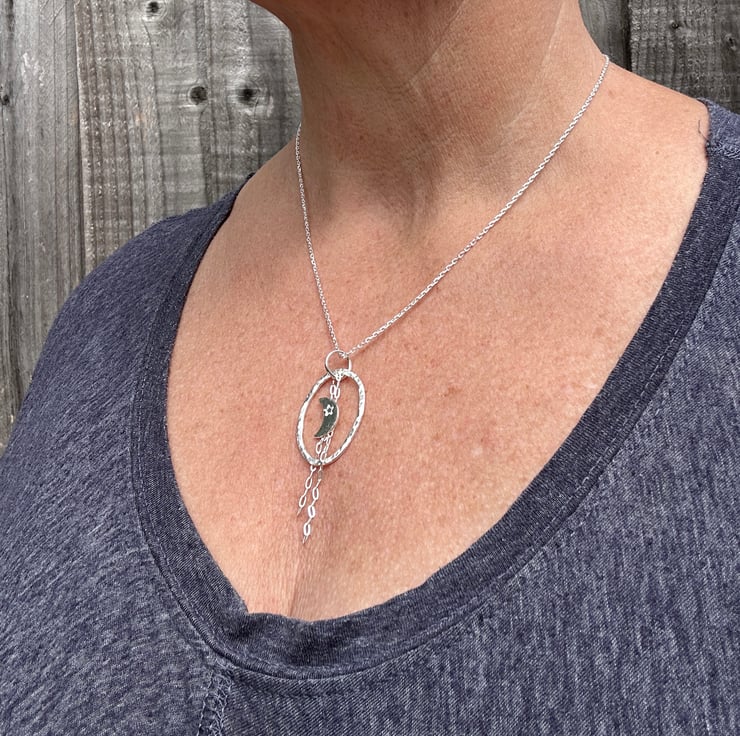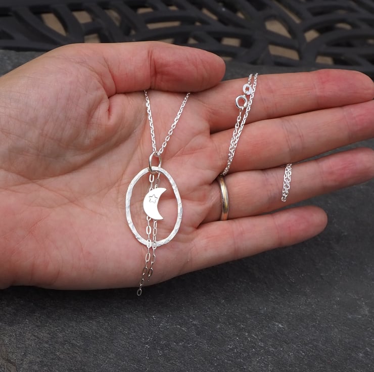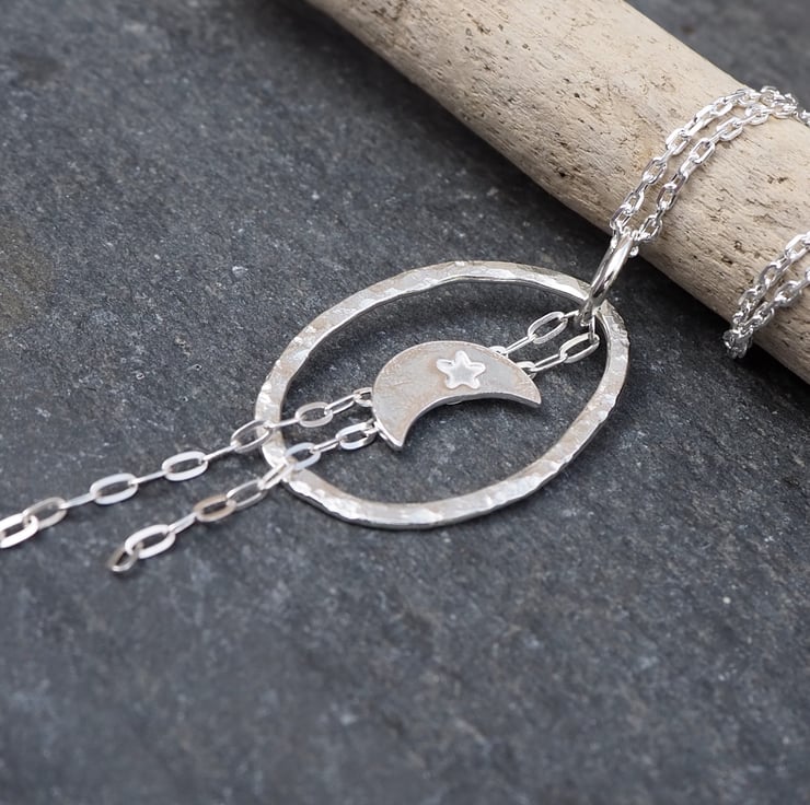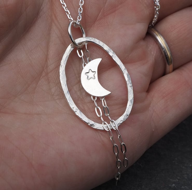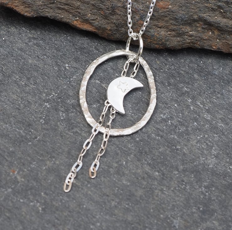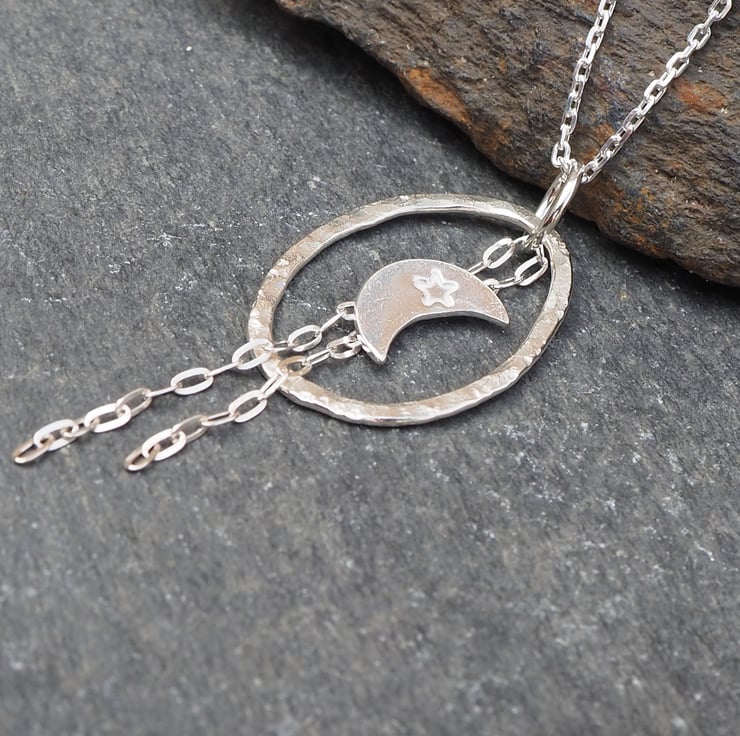 'When night falls' is a handmade silver pendant necklace featuring a crescent moon with a tiny star. The crescent moon swings by a delicate chain within a hoop of hammered silver.