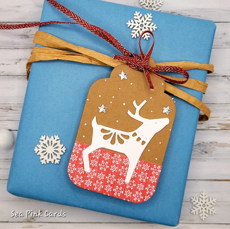 I die-cut the deer from double thickness white linen card, there is a deep border of snowflake style distressed patterned card at the bottom edge of each tag. Decorated with three clear crystal stars and hand-drawn white dots. I have attached a little matching bow to the cords of the tag. Unfussy and stylish, they look particularly well with simple plain wrapping paper.