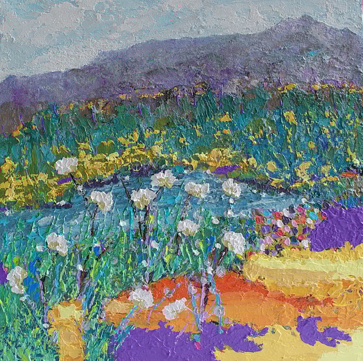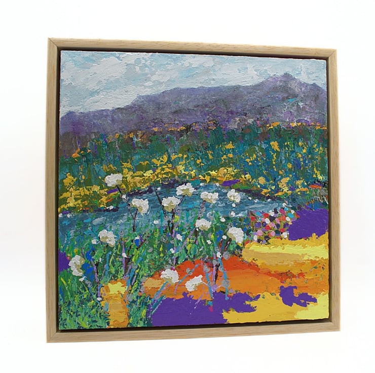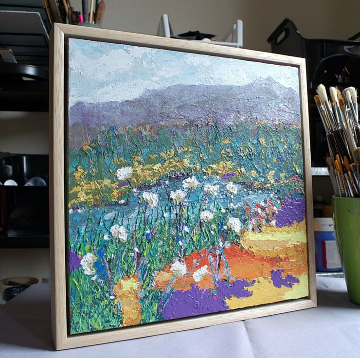 This colourful impasto landscape painting is ready to hang. It is based on my trips throughout the highlands of Scotland. I have used thick layers of acrylic paint and water based cold wax to build up textures to depict the ruggedness and beauty of the scene. I have used a range of painting knives to show a range of wildflowers and grasses. This original painting can act as a unique focal point to allow your thoughts to drift and feel at ease.