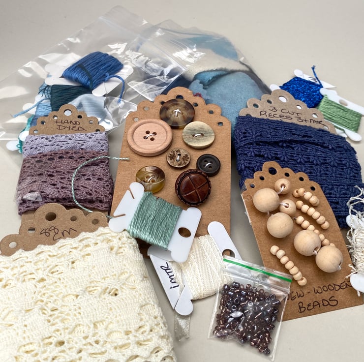 All the beautiful fabrics and supplies I have bought for Bearlescent over the past 11 years and knowing I can never use it all so I decided to make some slow stitched kits. My love of hand sewing and embroidery together with the beautiful trims and buttons in my fabric stash.