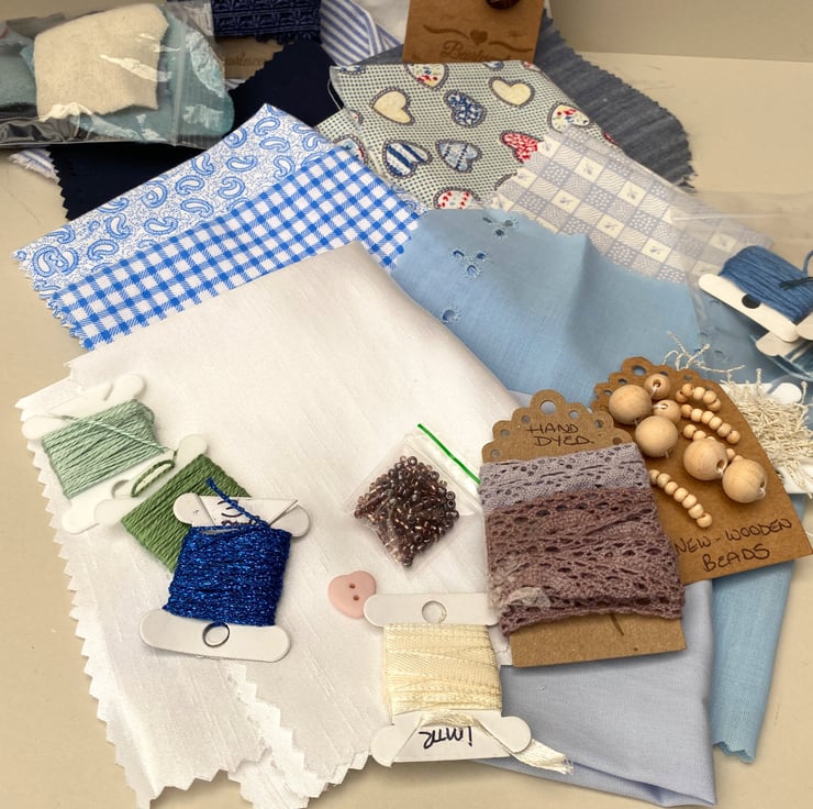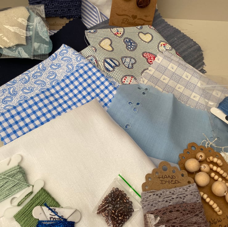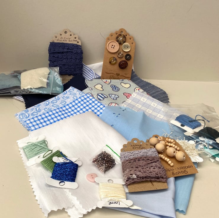 Slow Stitching project box with fabric and trimmings for collage, patchwork etc