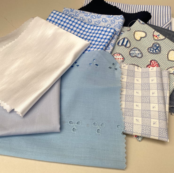 There's a mixture of patterned and plain fabrics in each kit, typical fabrics could be a mixture of Cottons, Poly cotton, Viscose, Silk, Satin, Lace fabric, Mesh, Corduroy, Velvet