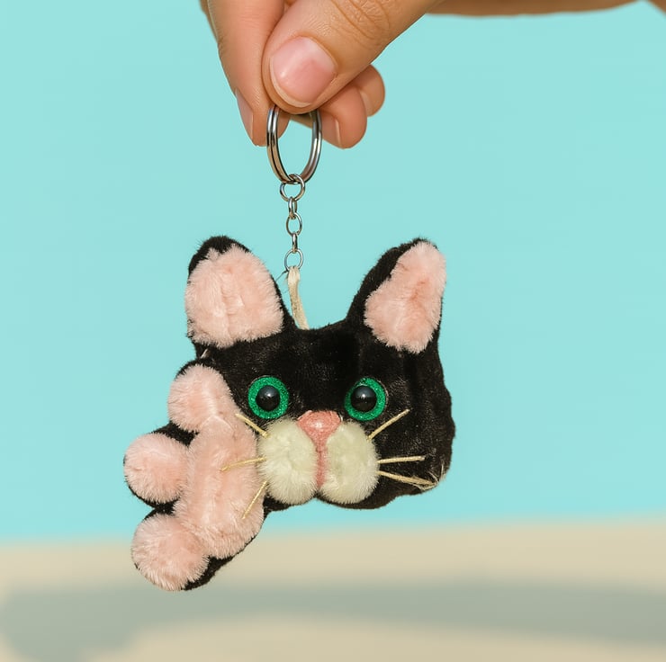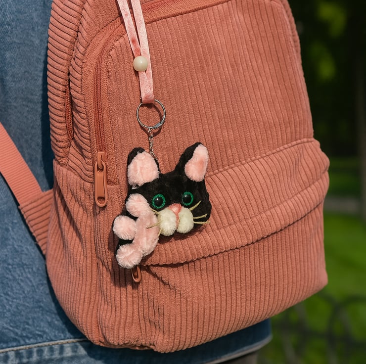 Adorable handmade black cat keyring with pink paw and ribbon charm. Crafted from soft pipe cleaners with green bead eyes and a pearl-accented ribbon. Perfect as a keychain, bag charm, or cute gift for cat lovers!