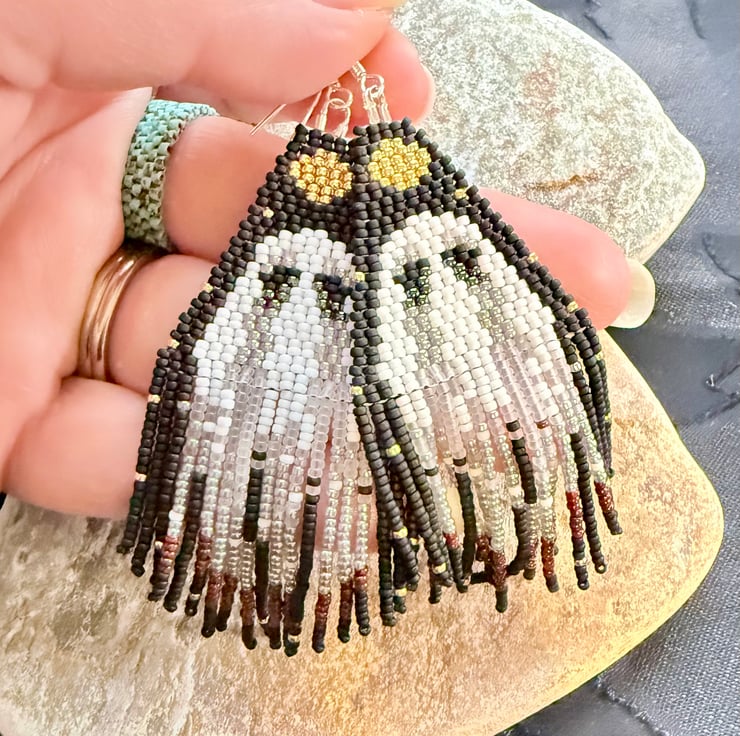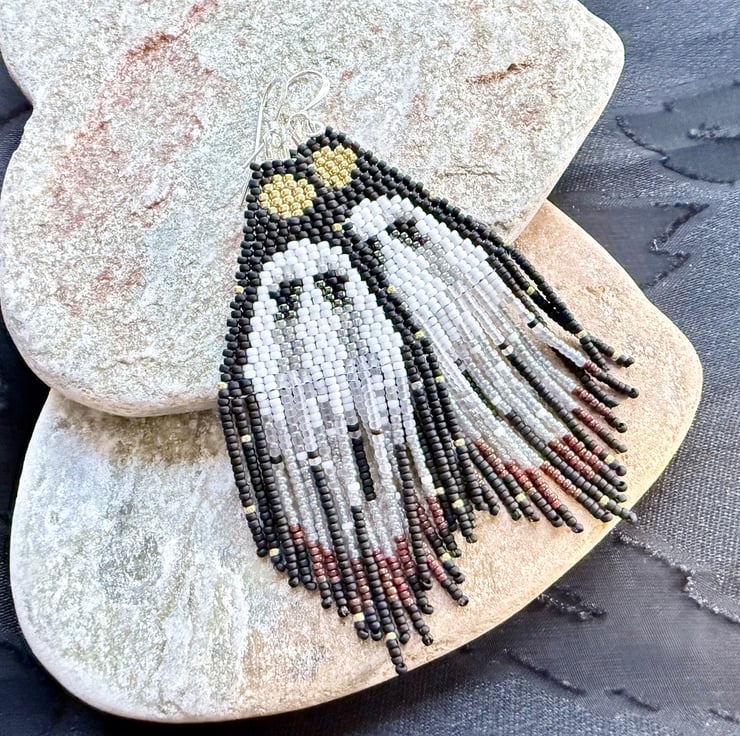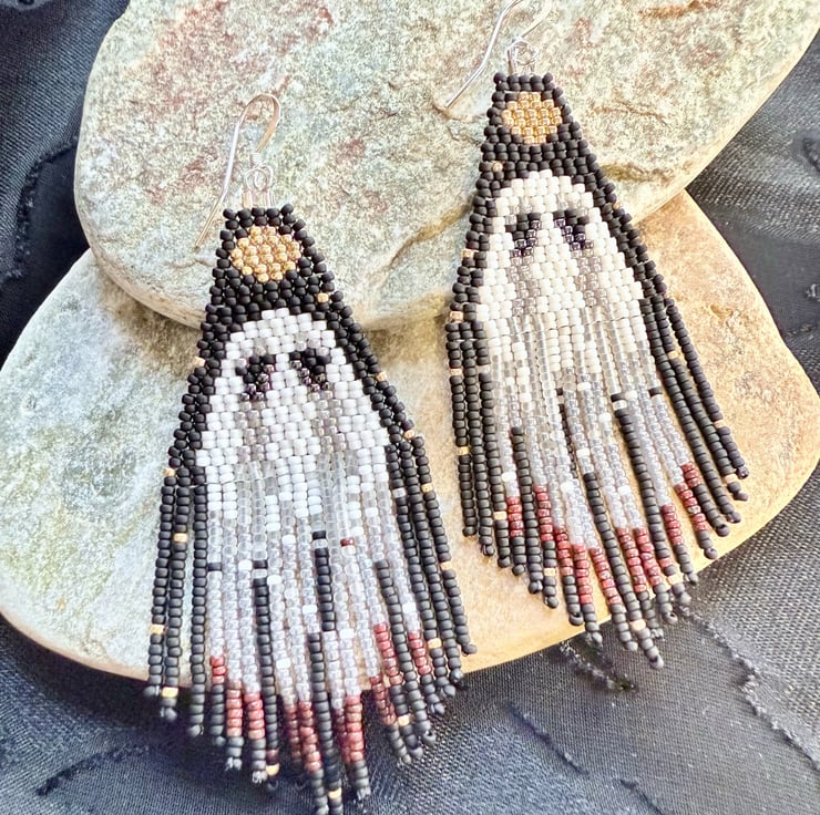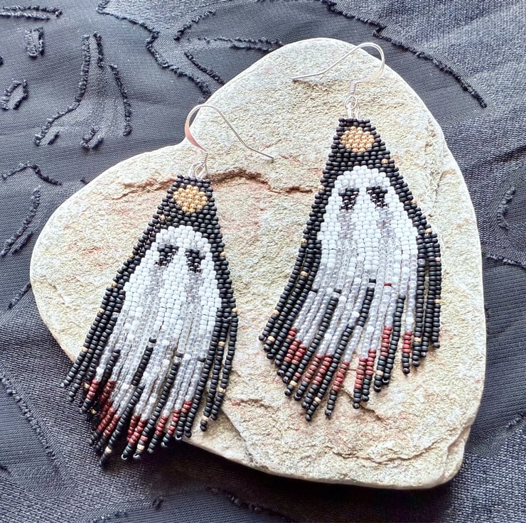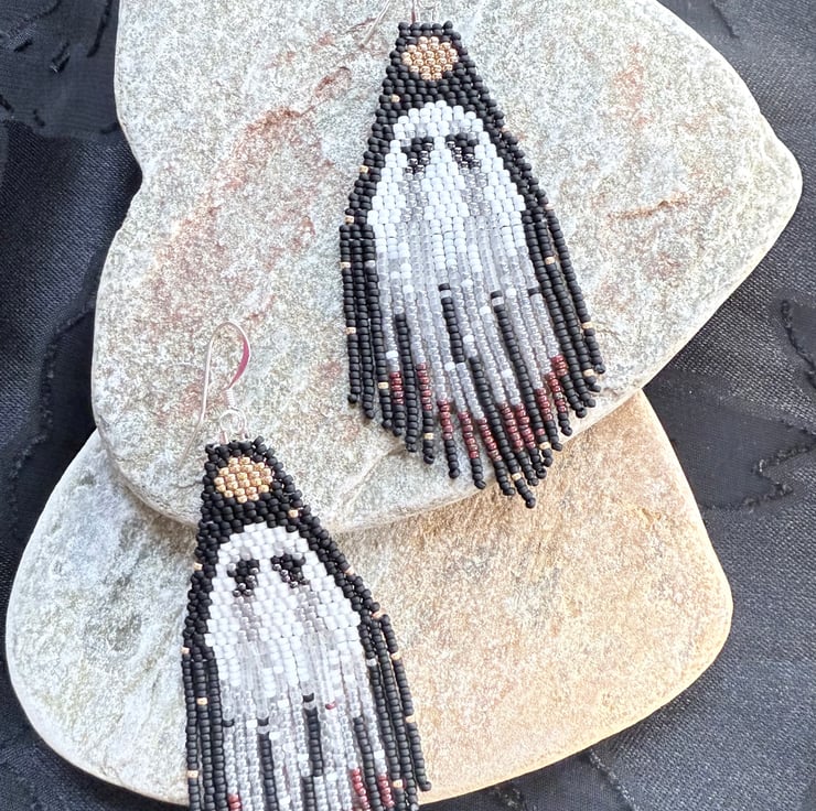 These spooky spectre earrings are handmade with the smallest Miyuki seed beads available. The beads are hand woven together with a long fringe hanging down. The pattern forms an image of a spooky spectre underneath a golden full moon..