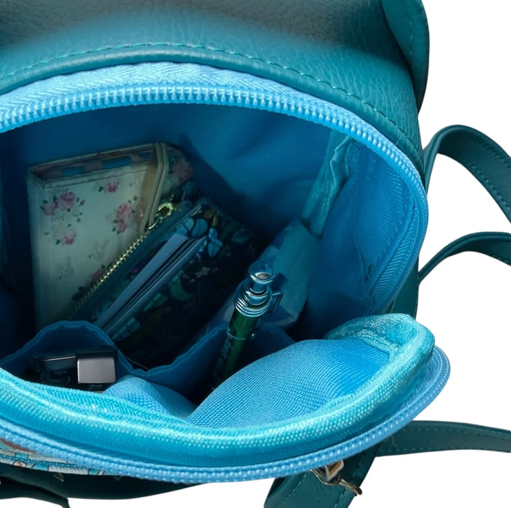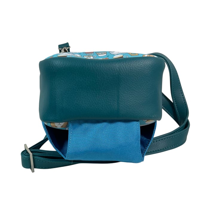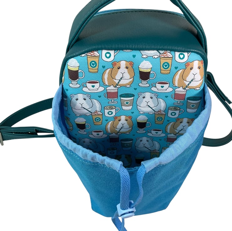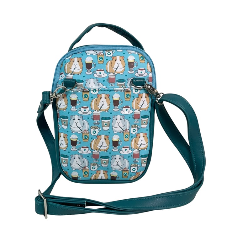 The bag itself is a nice sized little bag that has several pockets. In the back is a large slip pocket perfect for a phone . Inside is a side of small slip pockets just right for pens, tissues etc. I have entirely made this bag in water resistant fabric. The outer teal blue is faux leather and the feature cute guinea pigs and coffee cups print is vinyl.