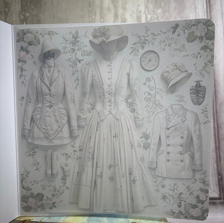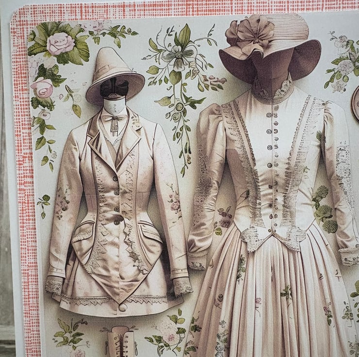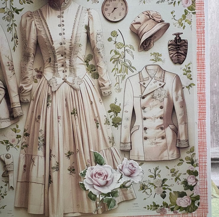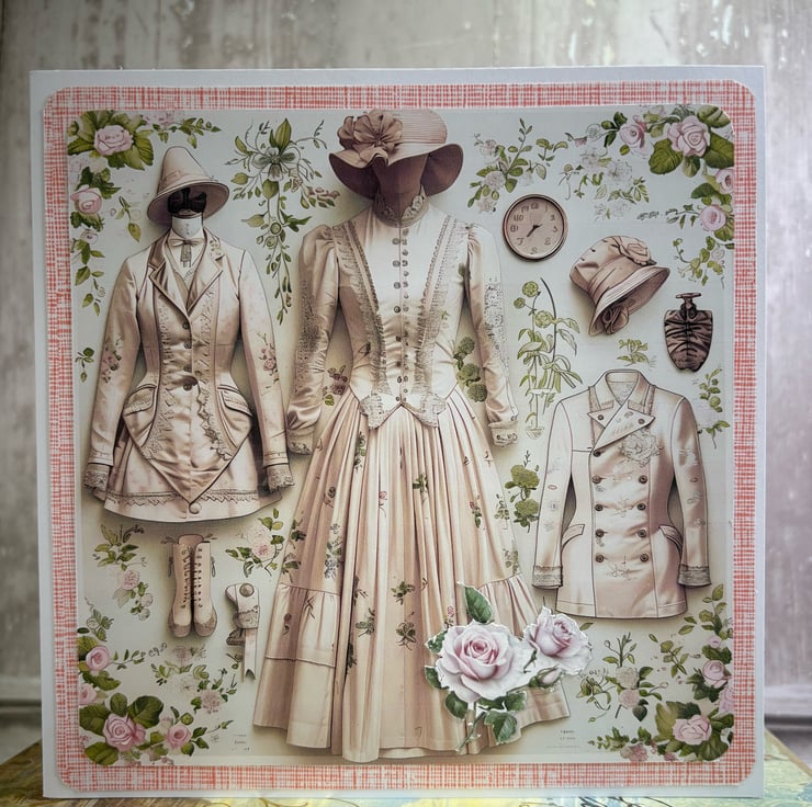 White 7” x 7” card topped with pink scratch design paper. Topper of a vintage fashion plate in muted shades of pink a neutral. Die cut roses added for detail. The inside has shaded fashion plate to match the front and has been left blank for your own message. White envelope included.