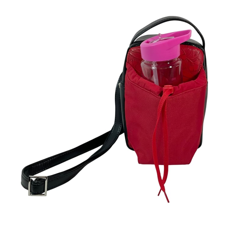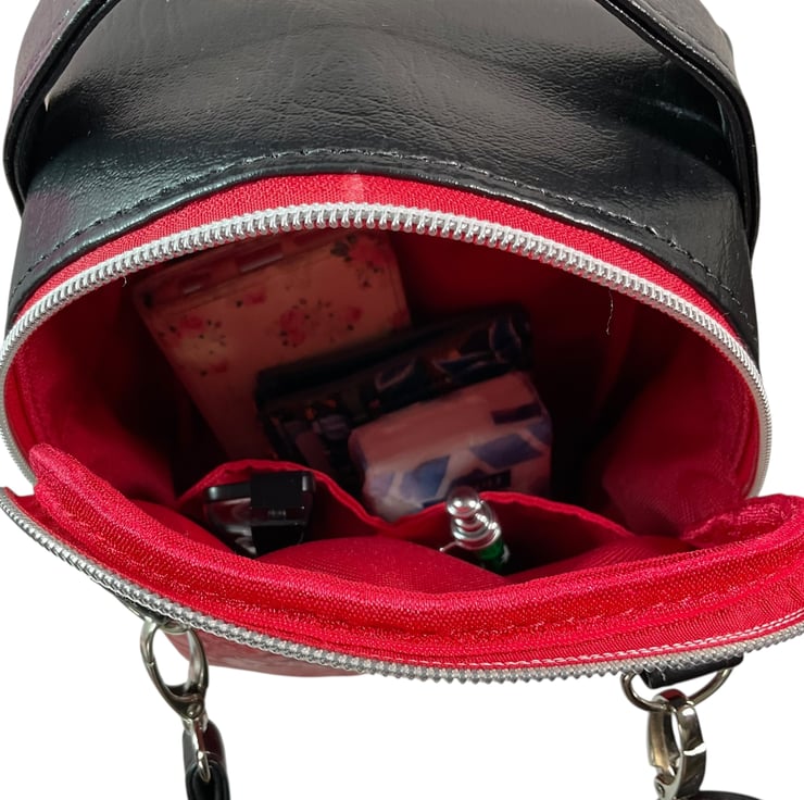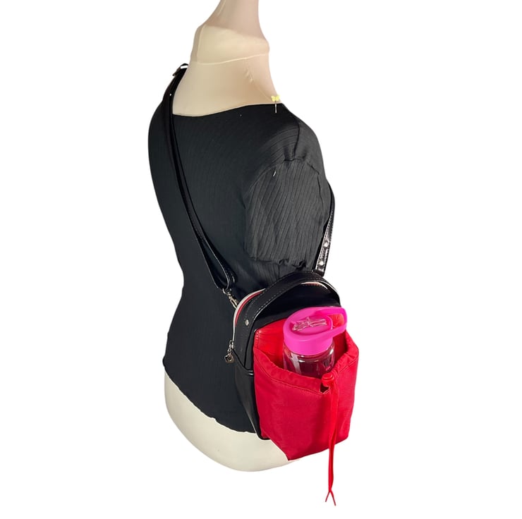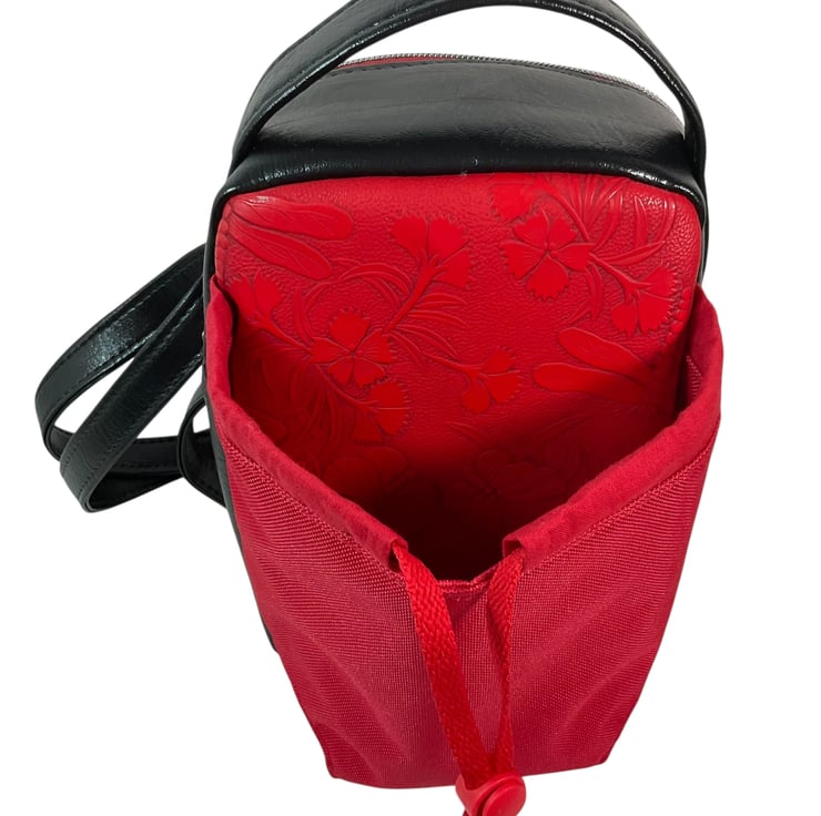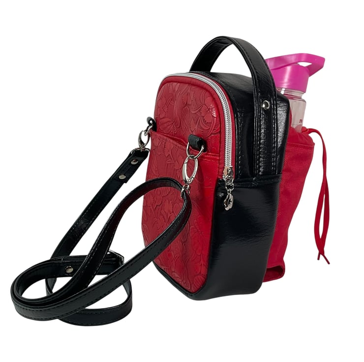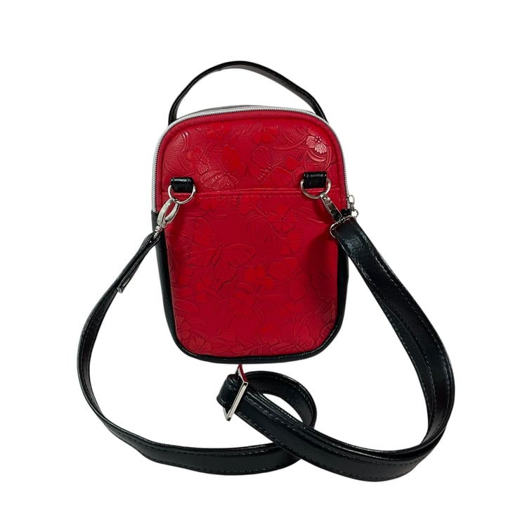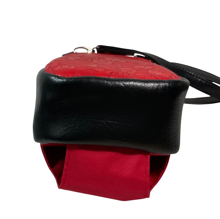 The bag itself is a nice sized little bag that has several pockets. In the back is a large slip pocket perfect for a phone . Inside is a side of small slip pockets just right for pens, tissues etc. I have entirely made this bag in water resistant fabric. The outer black is faux leather and the featured bright red embossed floral and butterfly print is vinyl.
