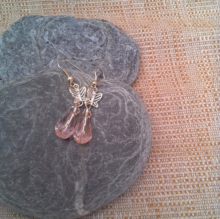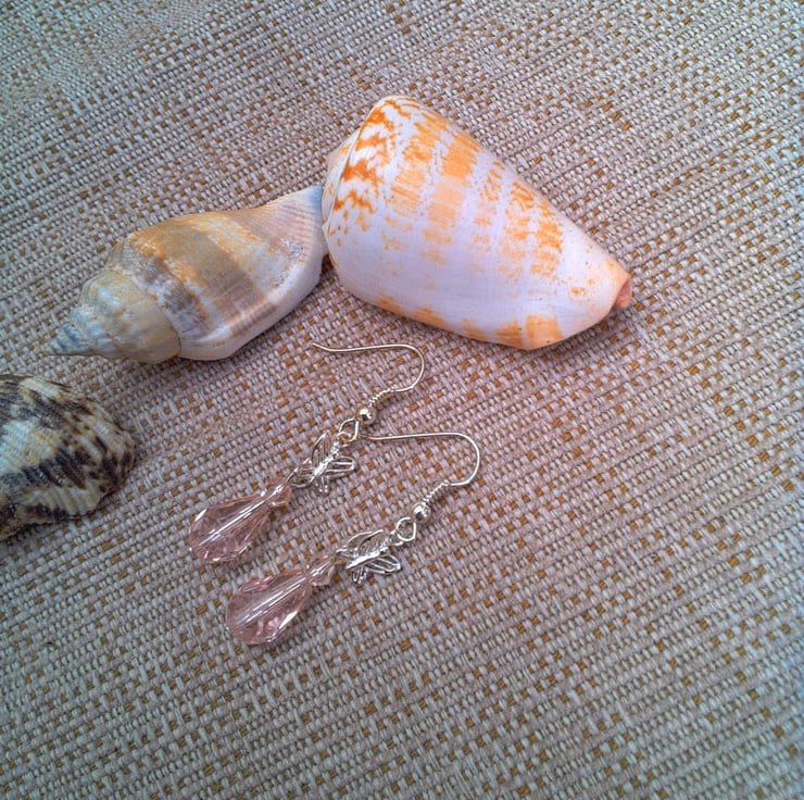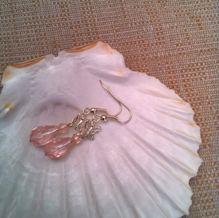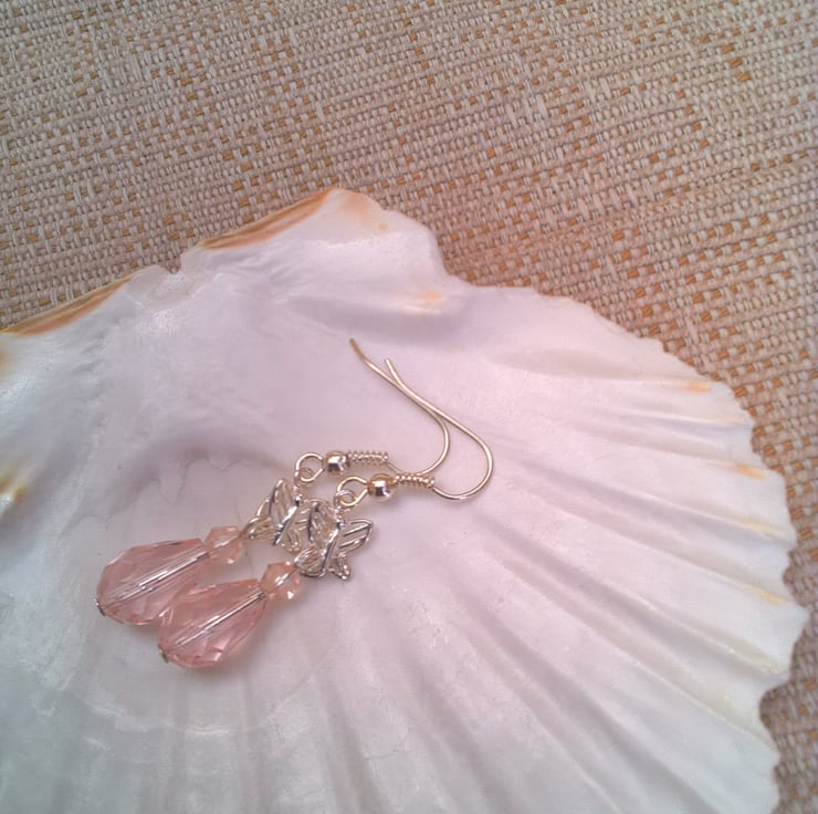 These pretty earrings would look great with any outfit you wear everyday or for a casual evening out. They would make a perfect gift for a friend or relative for a birthday or anniversary, or a treat for yourself. They are made using a 15 mm x 8 mm pale pink crystal teardrop bead with a 4 mm pale pink bicone crystal suspended on silver plated butterfly bail and silver plated hook ear wires and they have a drop of 1 inch (2.5 cm) from the base of the ear wire. The earrings will be dispatched wrapped in tissue paper in an organza bag and delivered to you via Royal Mail 1st class post.