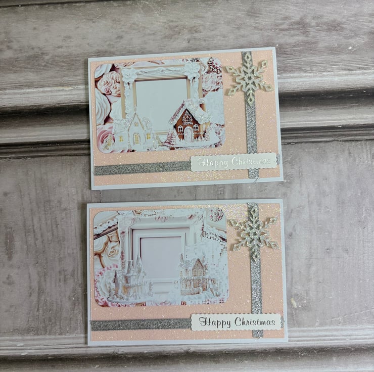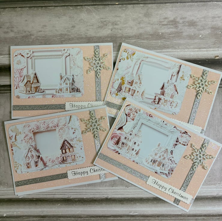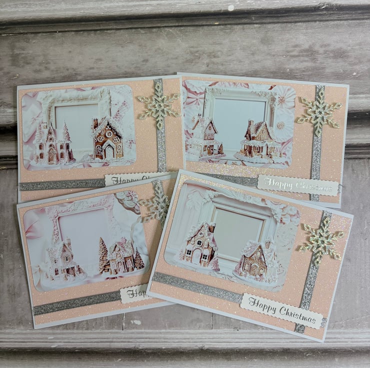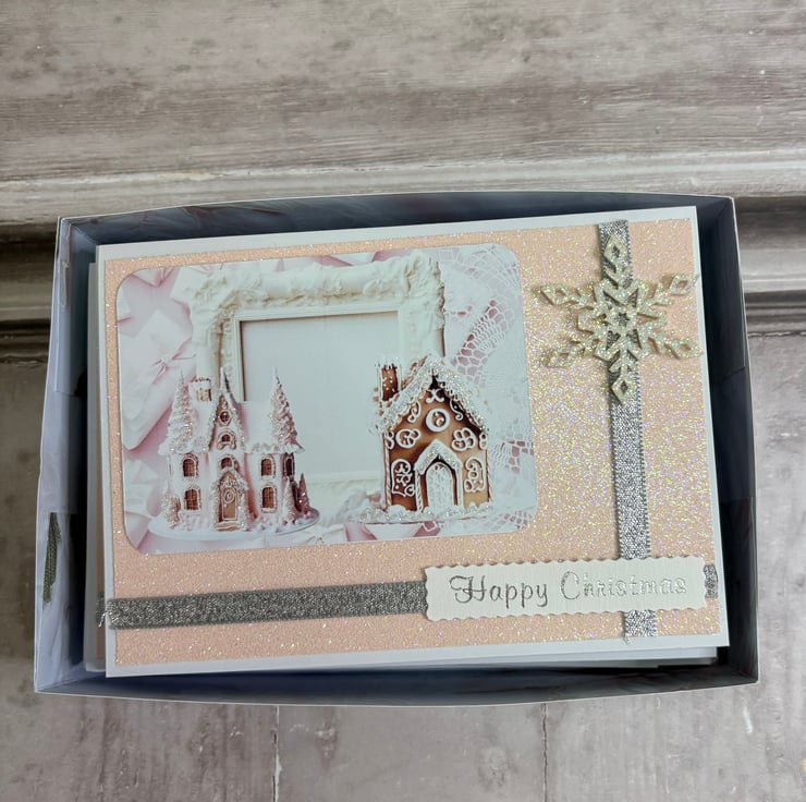Pretty Gingerbread patterned box, filled with 10 Gingerbread Cookie cards and Envelopes. Image mounted onto pink glitter card, Silver lurex ribbon a glitter snowflake and the wording Happy Christmas. Inside page reads 'Happy Christmas'. Cards are A6 and bx measures 6.75" x 4.5"