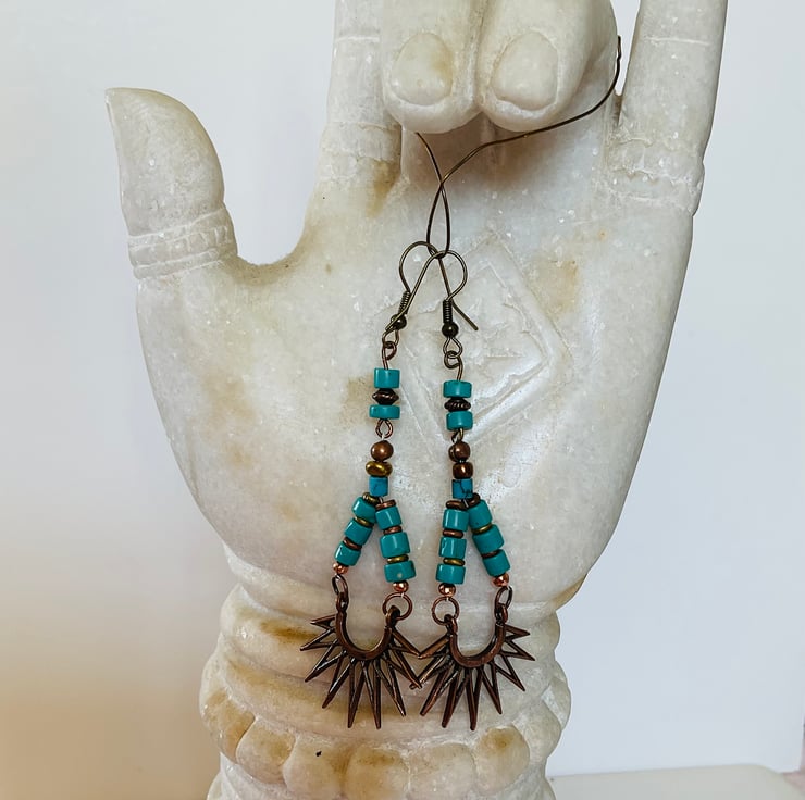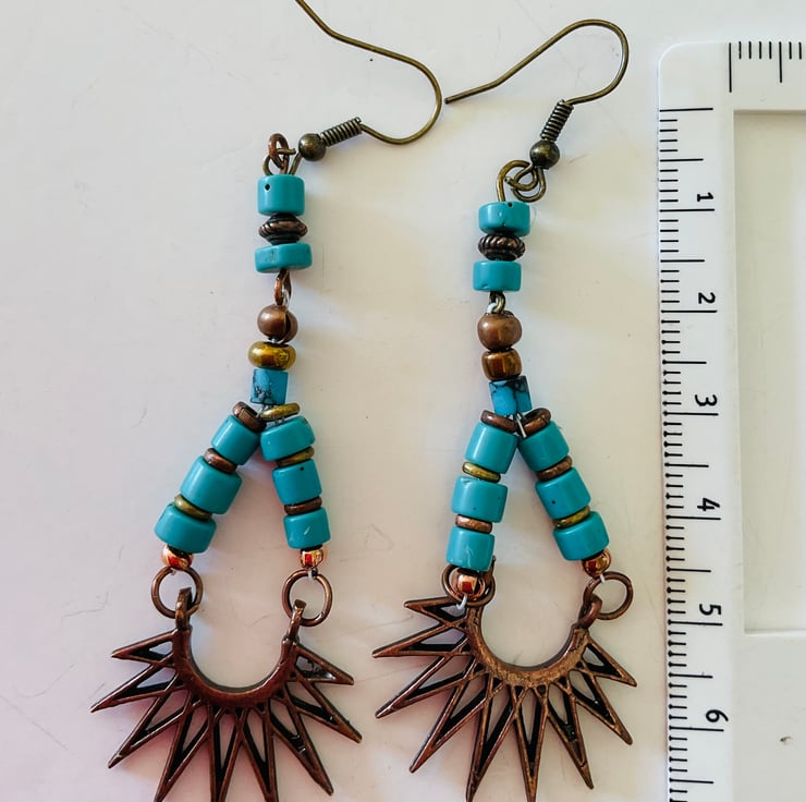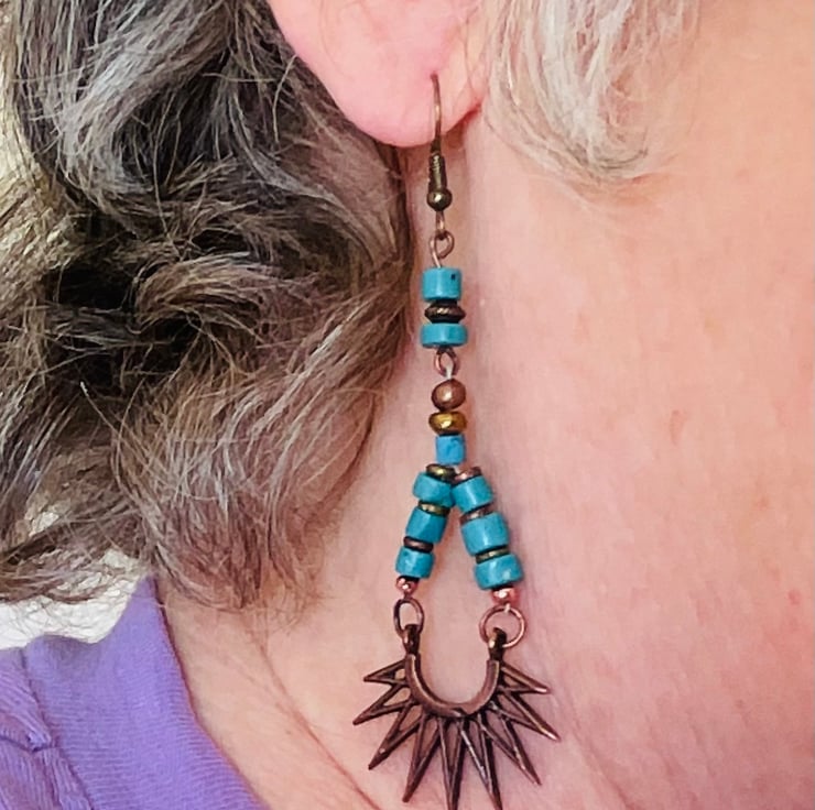 This pair of earrings features two strands of turquoise howlite and bronze beads. Suspended from these strands is a bronze sunburst. The style is ethnic/Navaho/Western. The drop is 7 cm and the width of the sunburst is 4 cm.