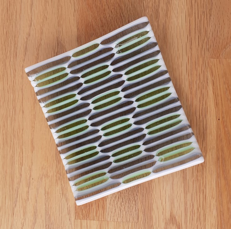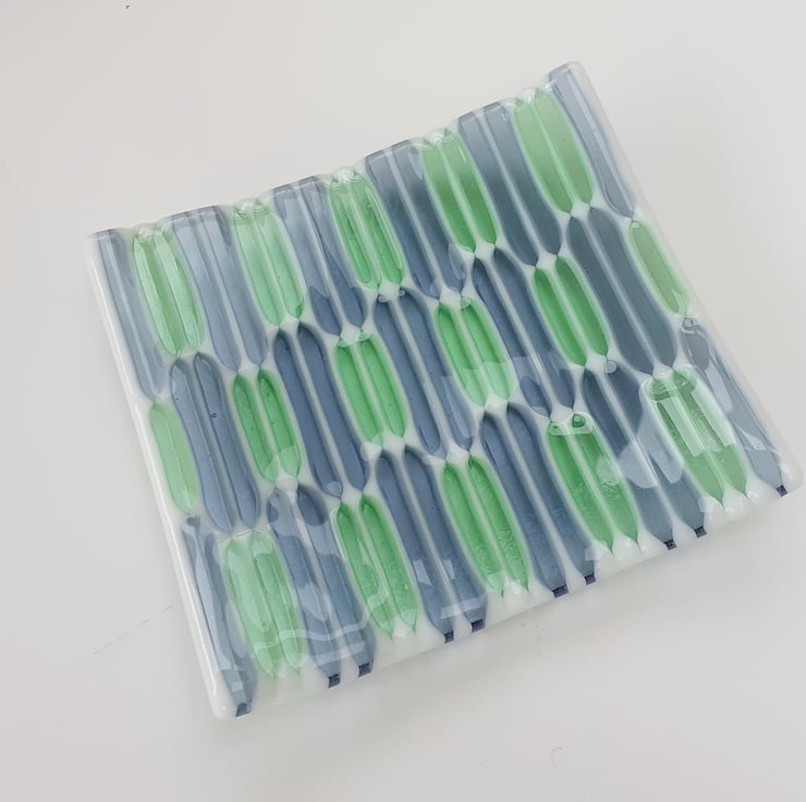 The strips are cut from transparent green and blue and white opaque art glass. It has a substantial chunky feel and semi-transparent appearance and measures 14 x 12cm with a maximum height of 2.5cm. Looks great as a display item - preferably place on a plain, white coloured surface or the surface will be visible through the transparent glass - as demonstrated in the final image