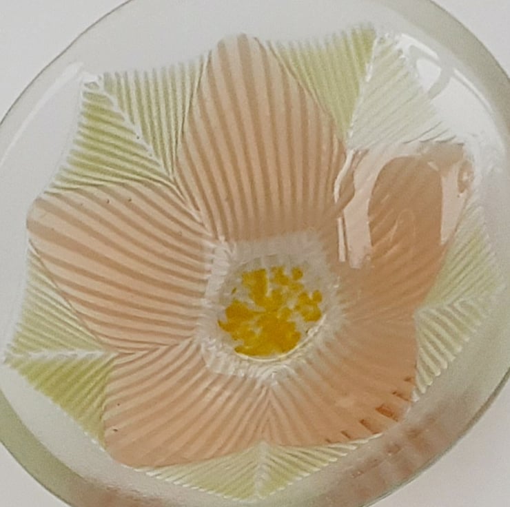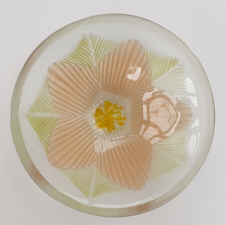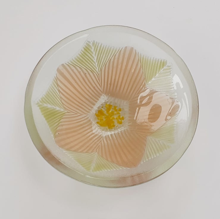 Constructed from clear art glass, champagne coloured transparent glass and white 'stringers', which are 1mm narrow glass rods, and accented with green and yellow glass powders, the dish required intricate laying out of the component pieces and multiple firings.