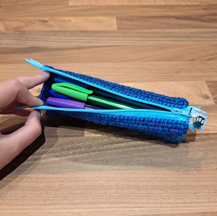 Dive into your day with a sea-themed pencil case. Shades of blue, purple, and green mingle together, with a light blue zip, and blue zip charm (charm is store-bought).