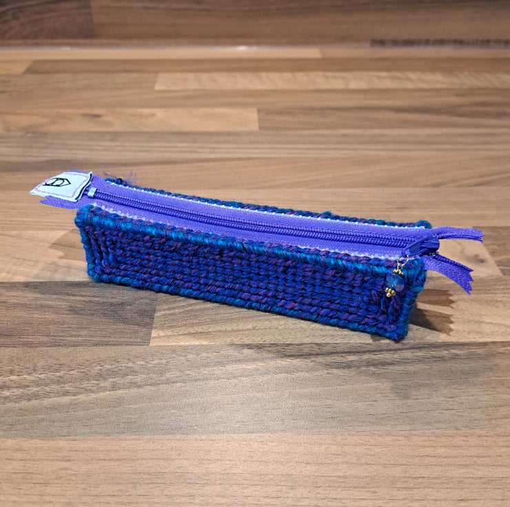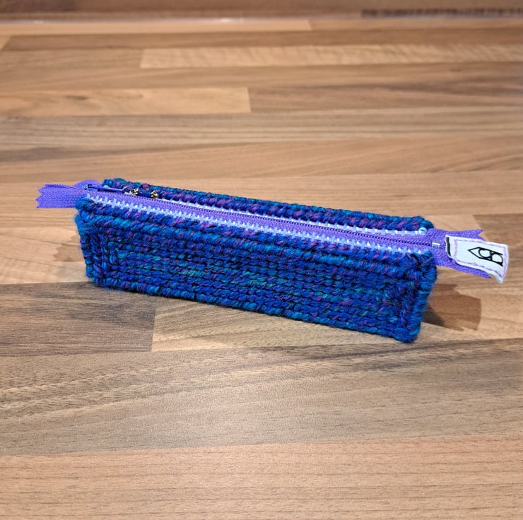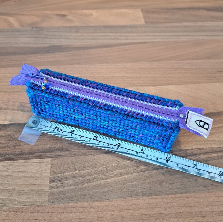 Dive into your day with a sea-themed pencil case. Shades of blue, purple, and green mingle together, with a purple zip with exposed edge, and purple zip charm (charm is store-bought).