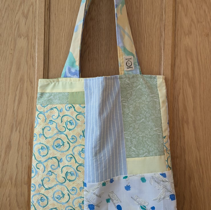 Reusable cotton bag, feels sturdy. Made from cotton so washable and strong.Made up from a collection of fabric scraps. This tote bag contains a mix of green and yellow solid segments aswell as green teddy bears, birdies, swirls and strips. Each segment complementing each other perfectly.