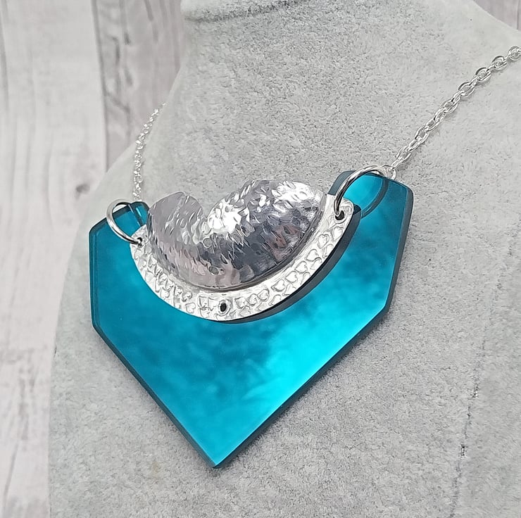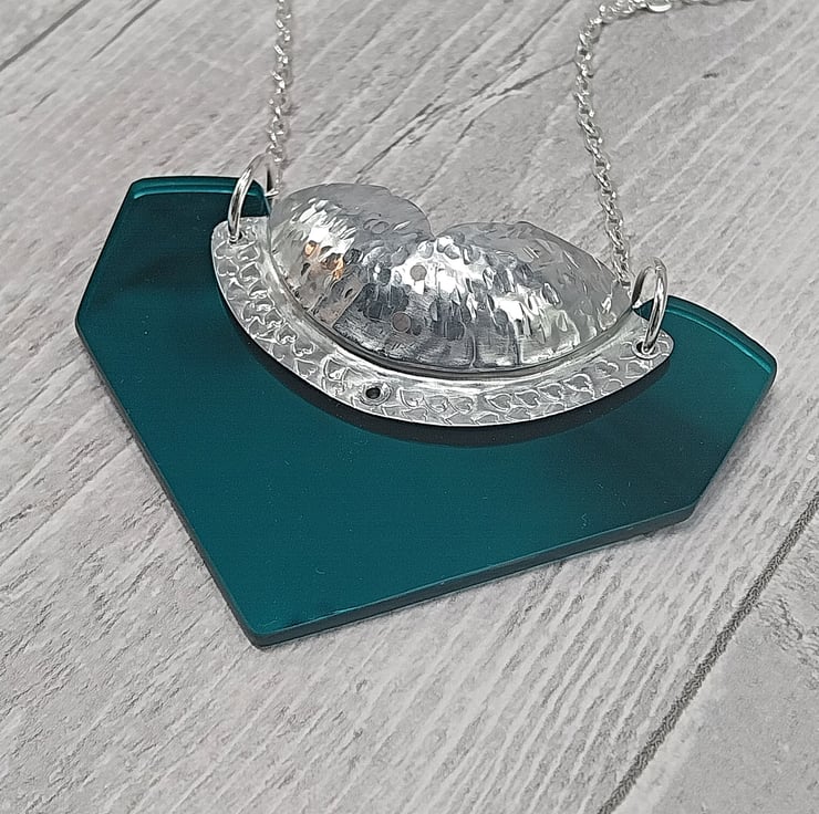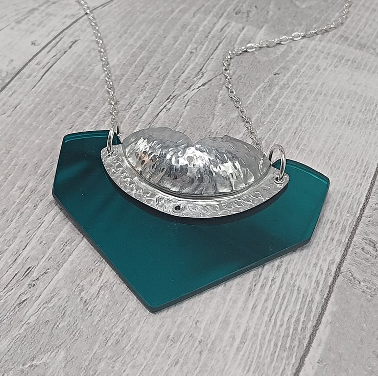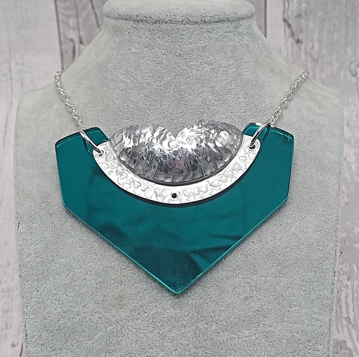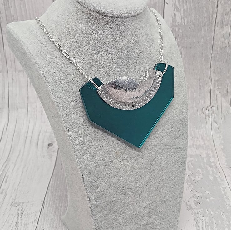 Handmade necklace made from recycled aluminium drink can complemented with the addition of a mirrored teal acrylic shape. The design focuses on the metal base of the can incorporating the domed shape which I have cut, shaped and hammered texture too giving this necklace it’s unique and one-of-a-kind individuality. The acrylic shape made by hand also with a striking bold shape and colour, this is riveted to the metal using aluminium tubing. Eco-friendly material and lightweight and comfortable to wear for all occasions.