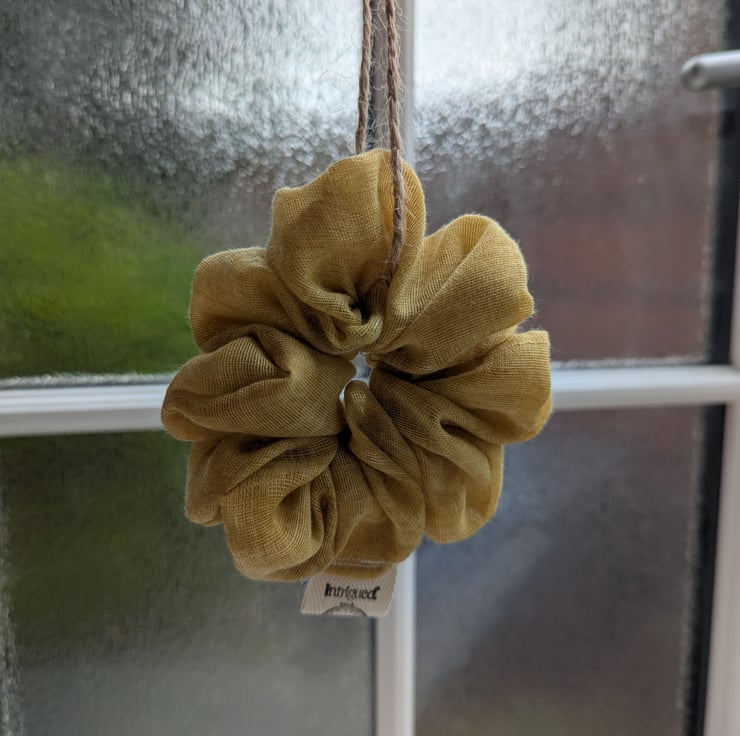 These mustar yellow scrunchies have a scatters of sparkle in them. Made from a thrifted scarf, these scrunchies are too cute for your summer wardrobe.