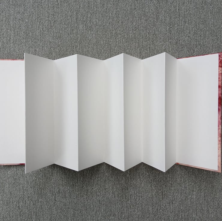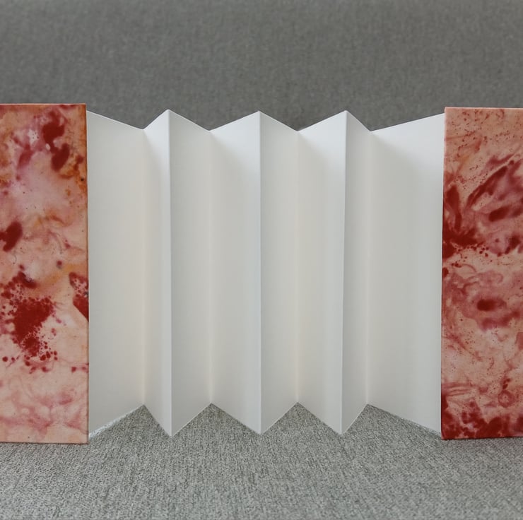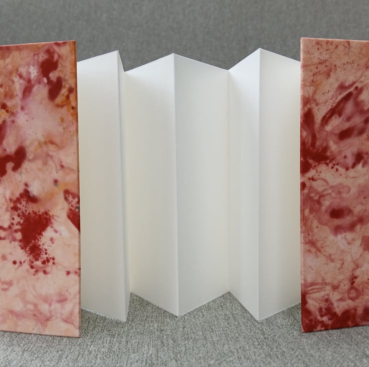 This listing is for an accordion book which has covers made from ice dyed silk. Ice dyeing is a technique whereby ice is layered on top of the silk fabric and dye powder is sprinkled over the ice. As the ice melts, the dye powder seeps into the fabric and produces beautiful and interesting patterns. Each piece of fabric is unique. The book is made of 2 pieces of 240gsm acrylic paper and has 18 surfaces, 10 on the front (including the inside covers) and 8 on the back. Each surface measures approximately 5cm x 12cm and the book measures approximately 5.5cm x 12.5cm. The book is perfect for any project, e.g. illustrations, text, collage. I have tried to photograph the covers so that the colours are as accurate as possible but please be aware that colours can look slightly different and may vary on different screens.