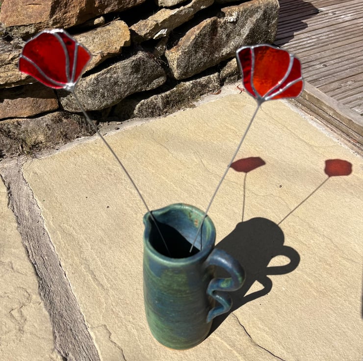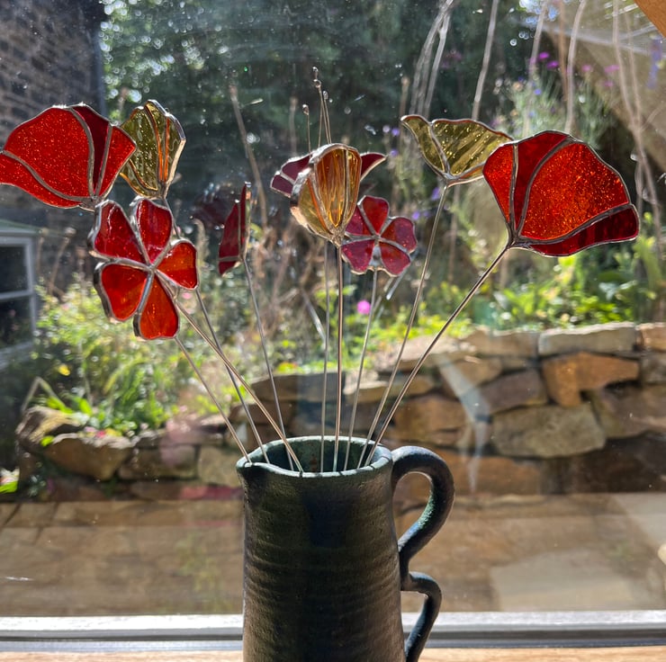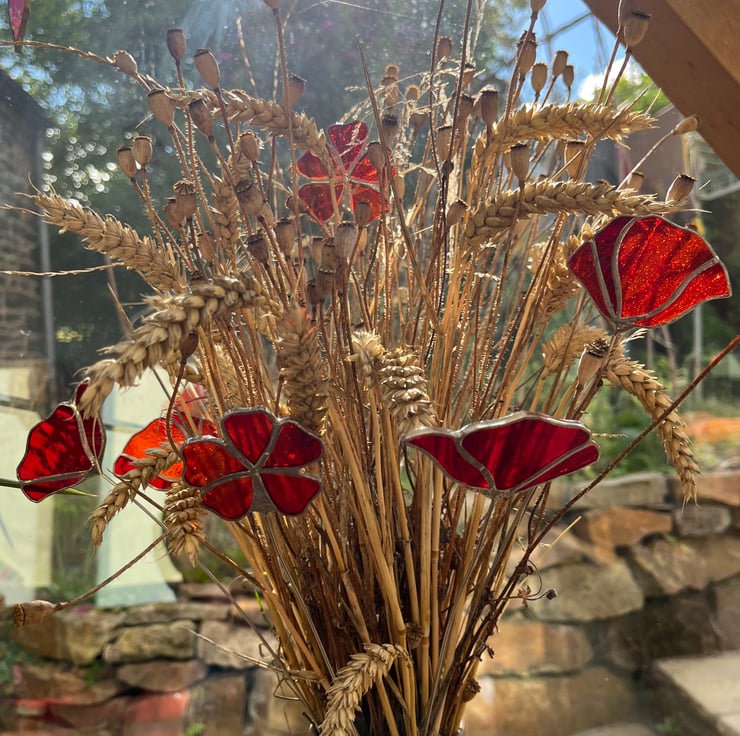 Glass poppies are perfect for an August birthday, or as part of a wild flower bouquet. Either alone or with more of my stained glass poppy designs, it adds a great pop of colour to a bunch of dried corn, barley, or poppy seed heads.