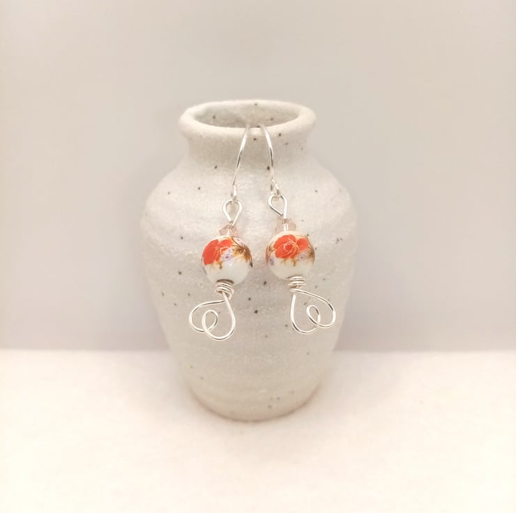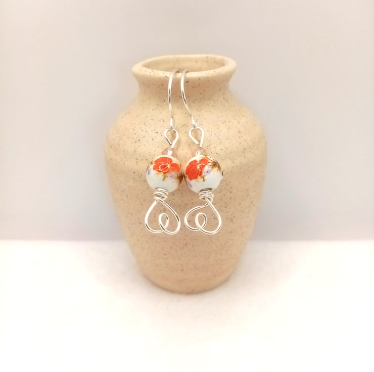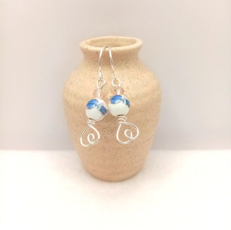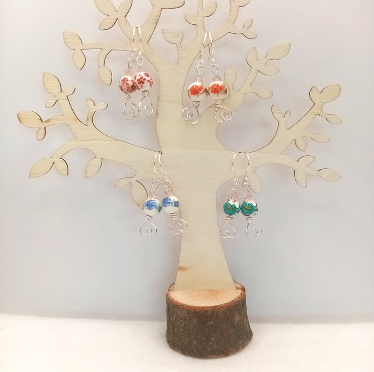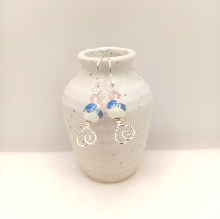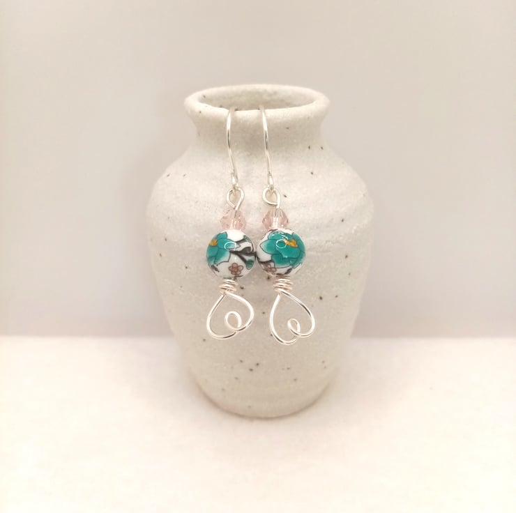 These pretty dangle earrings are made using 8mm ceramic porcelain and feature a lovely flower pattern, topped with a bicone faceted crystal glass spacer bead and finished off with a cute love heart design on the base.