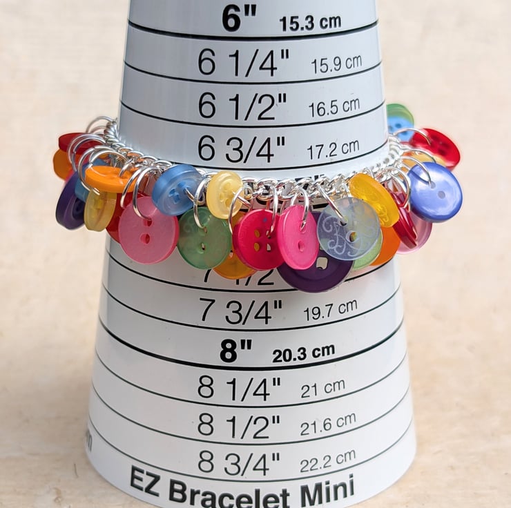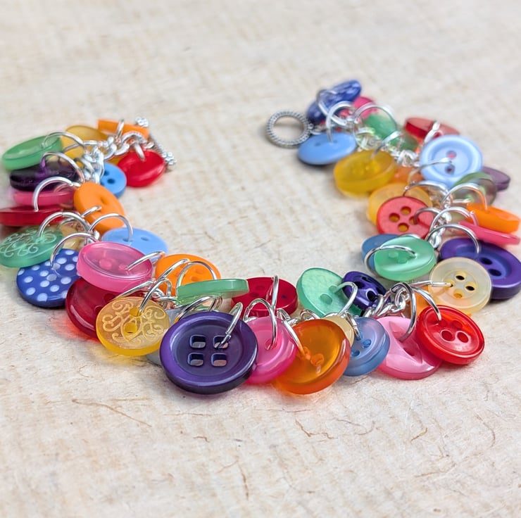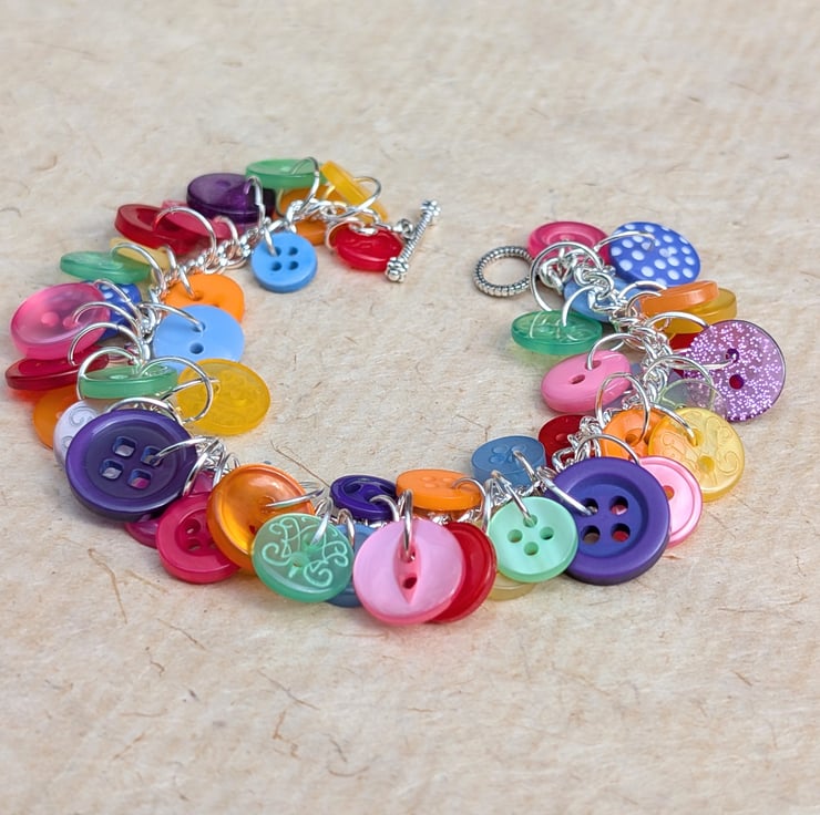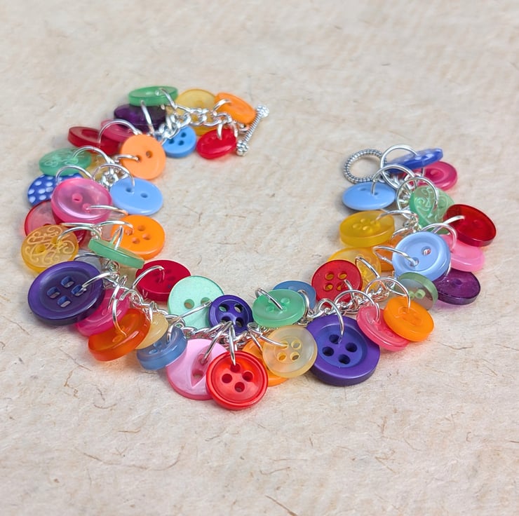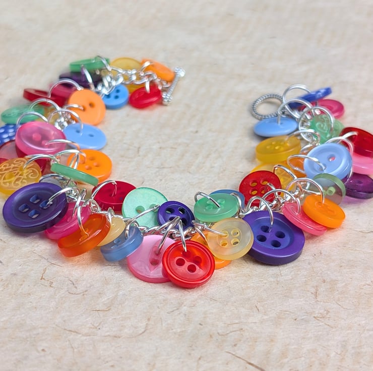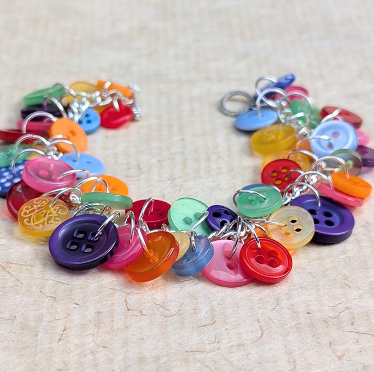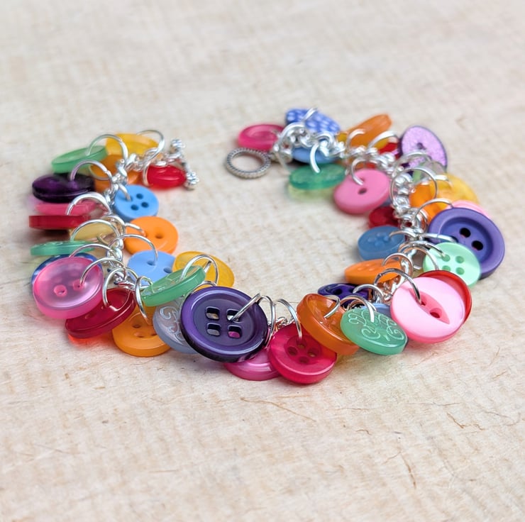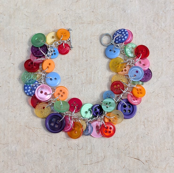 Each button is individually selected and attached with jump rings, giving the bracelet a wonderful movement and a lovely jangle when worn. It's a cheerful, one-of-a-kind piece.