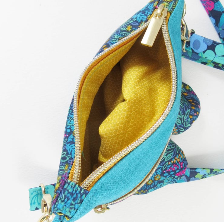 This unique bag has a full width zipper pocket on the front. The main bag also has a zipper closure. The outer bag is a delightful mix of gorgeous shades of peacock blue, deep blue, pinks, lavender, dark gold and blue-green. Sure to enhance many outfits and bring a smile to many faces! The cotton lining of the main bag and front pocket have a small honeycomb print on a dark gold background.
