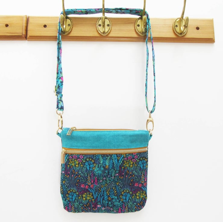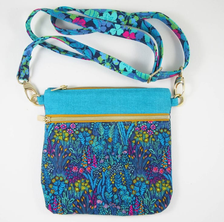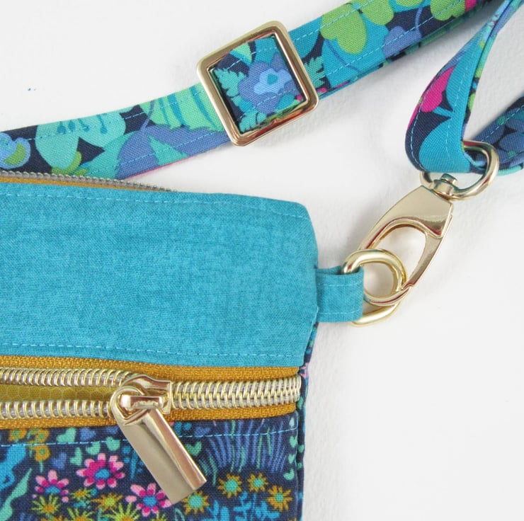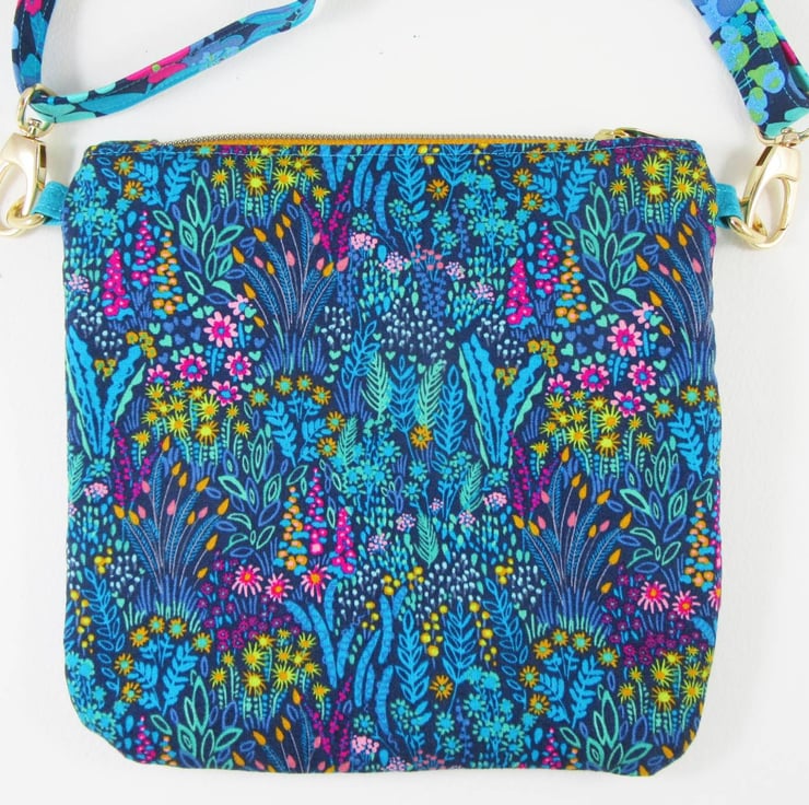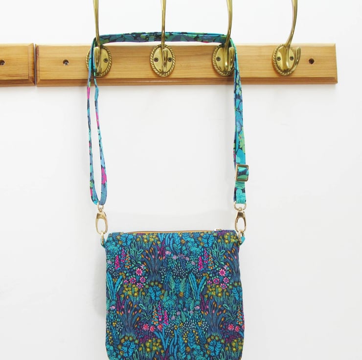 Stunning Sally Kelly cotton prints give this neat bag a real zing! The bag measures 20.5cm high by 20.5cm wide (8.25" x 8.25"). The adjustable strap is 2cm (0.75") wide with a maximum length of 140cm (55"). The strap can be unclipped from the main body of the bag.