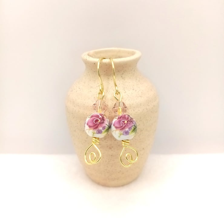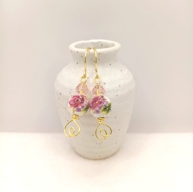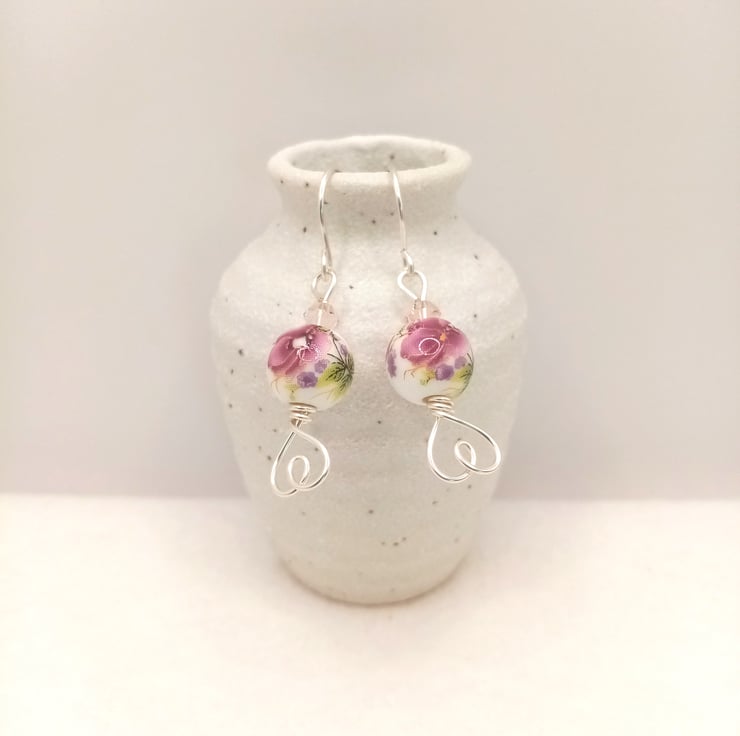 Rose Flower Pattern Drop Earrings, Plum Rose Dangle Earrings, Ceramic Porcelain