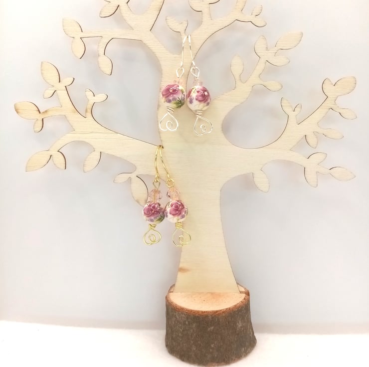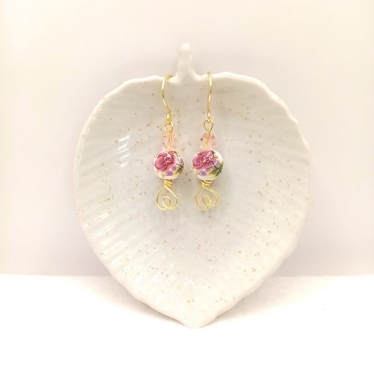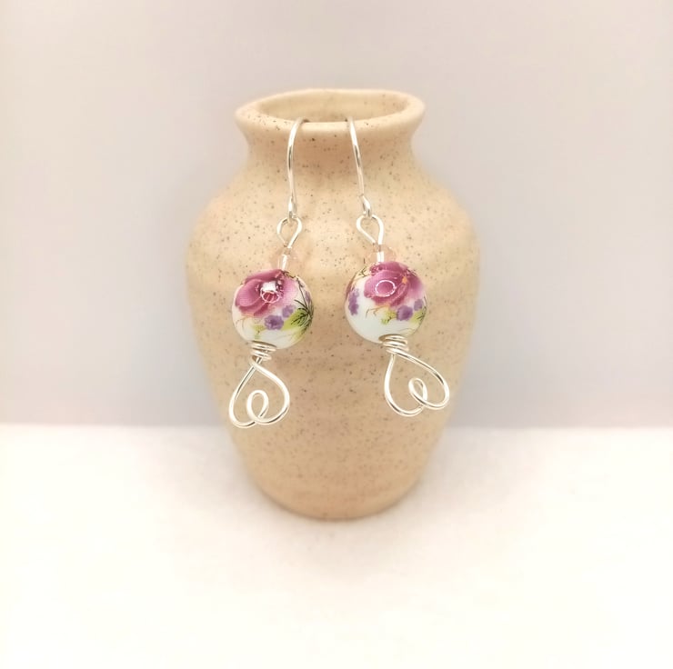 These pretty dangle earrings are made using 10mm ceramic porcelain beads topped with a bicone faceted crystal glass spacer bead and finished off with a cute love heart design on the base.