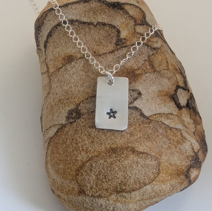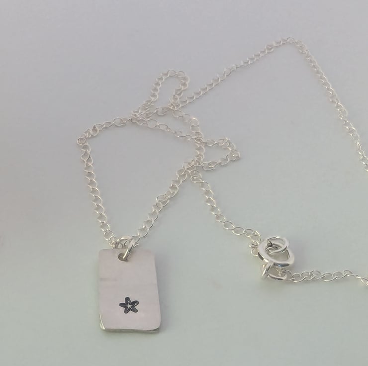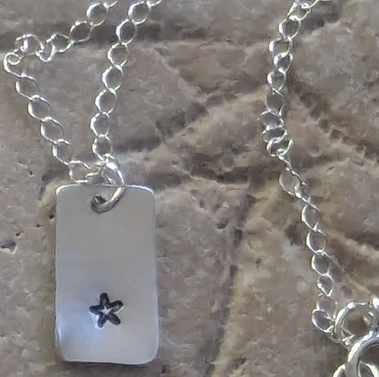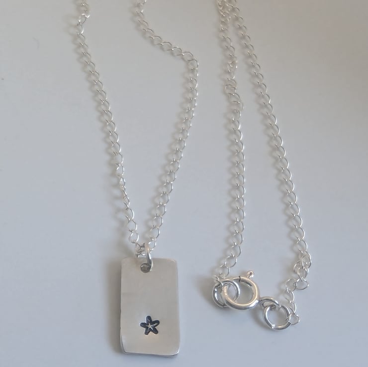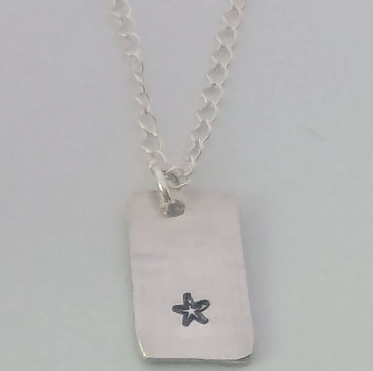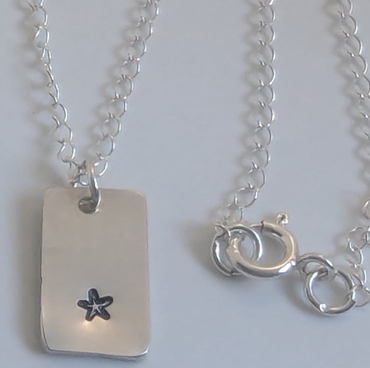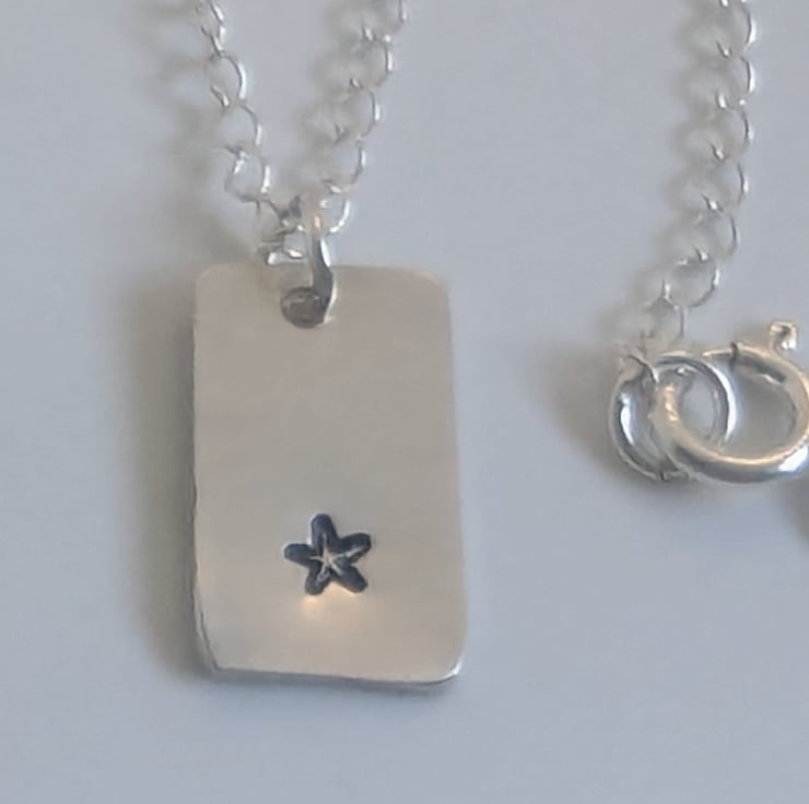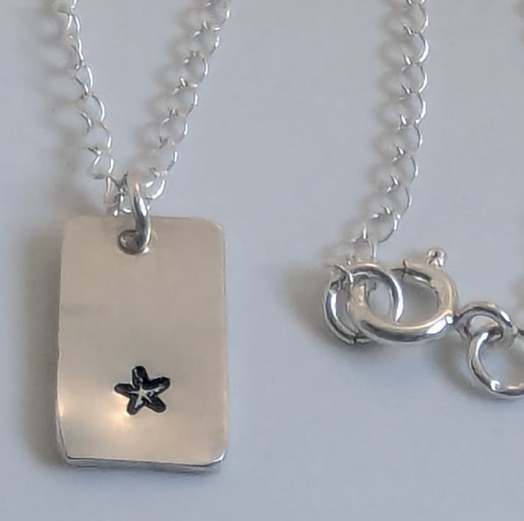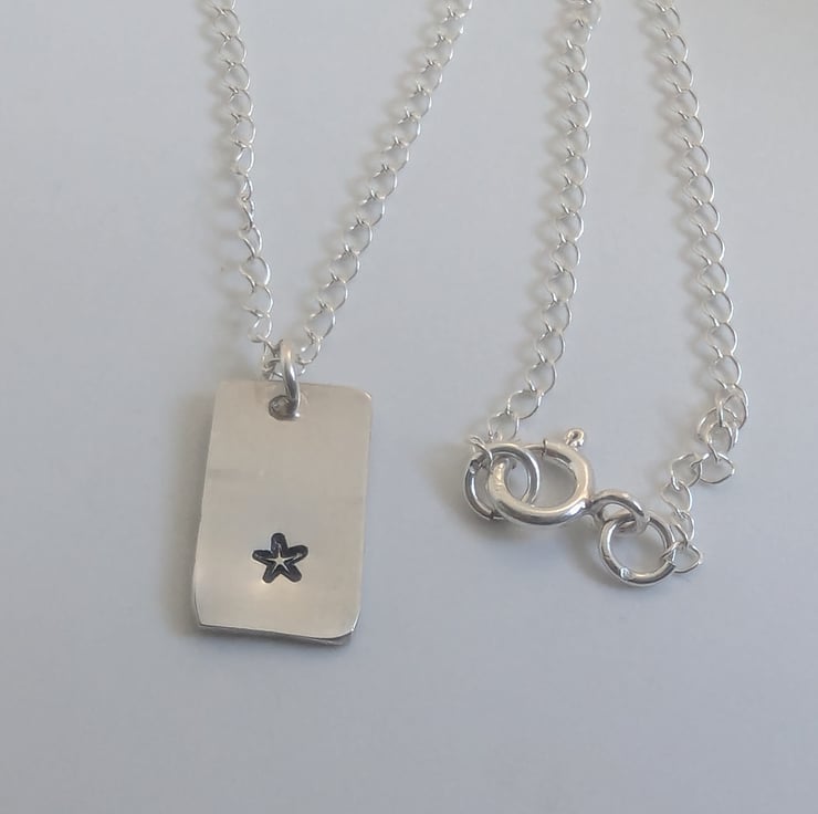 Cute little star hand- stamped onto recycled sterling silver. The pendant measures approximately 1.5cm x 1cm. The chain is around 16 inches long.