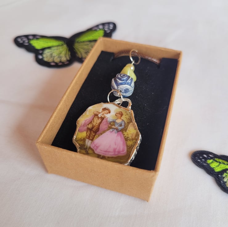 Made with lead-free solder, broken jewellery, vintage ceramics, and stainless steel/zinc alloy jump rings/pins. Wax cord chain: 5cm extension chain, 45 cm in length. Metal - 14ct 3 colour gold.