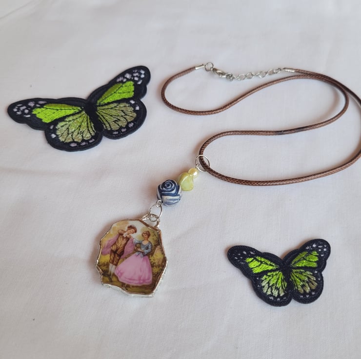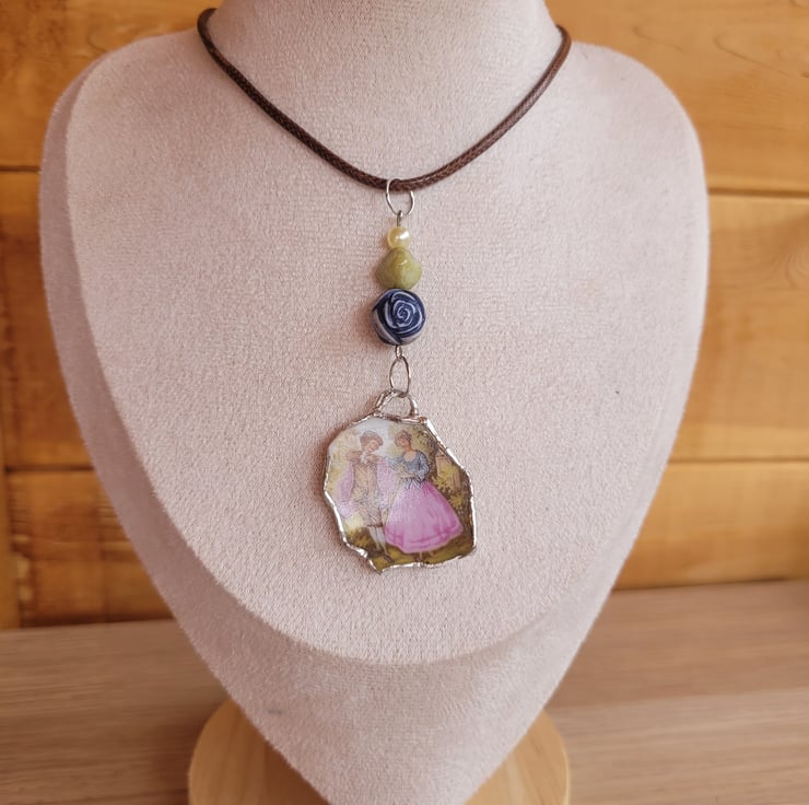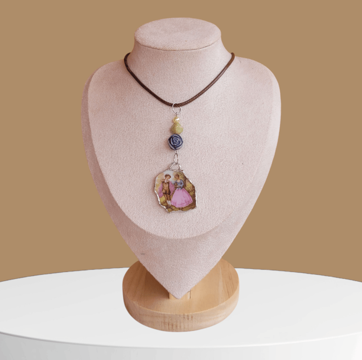 Upcycled Couple Ceramic Plate Necklace with Brown Cord.