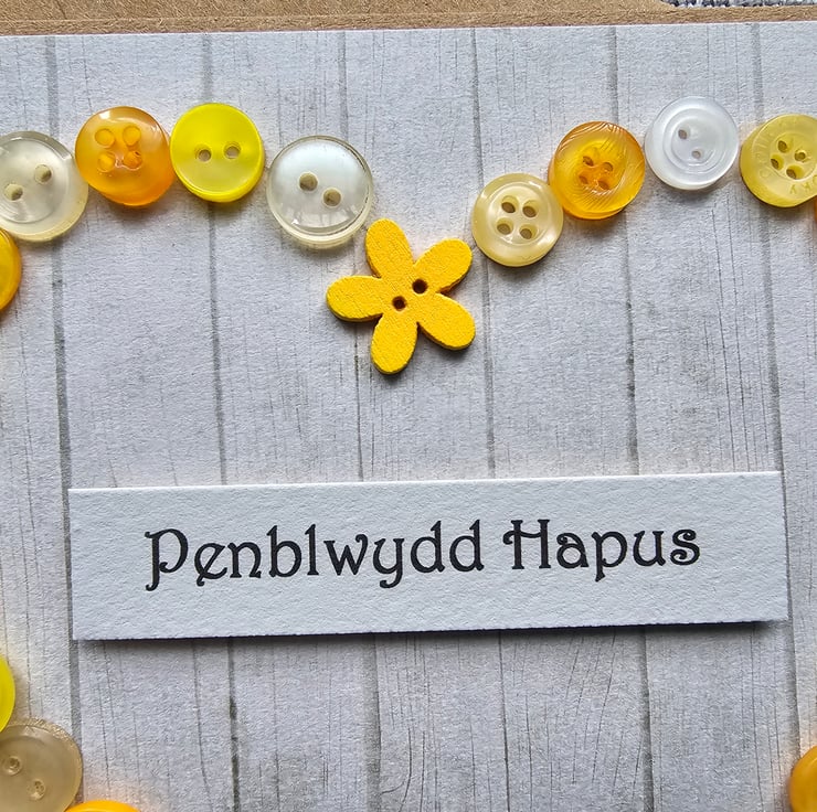 Welsh happy birthday wishes in sunny yellow shades, a unique and handmade card.