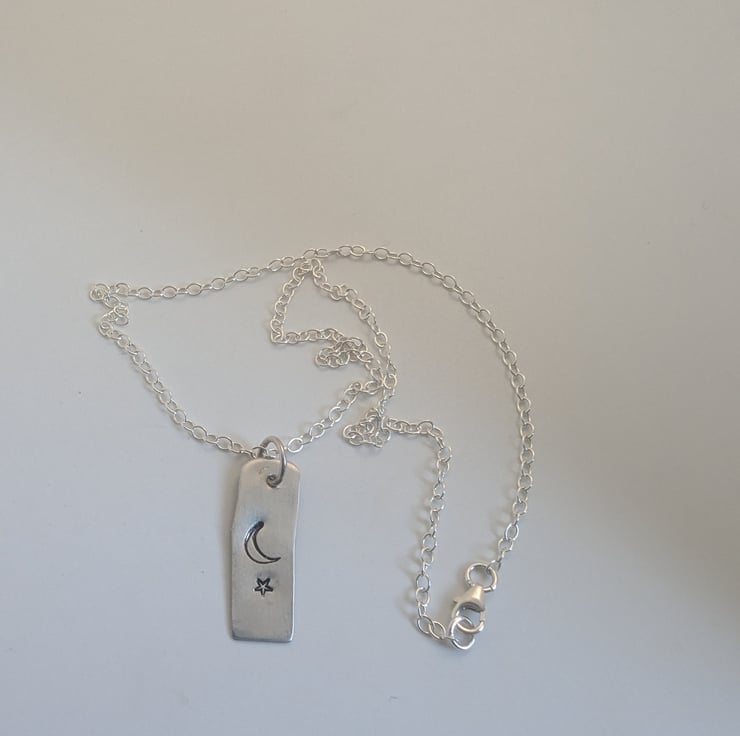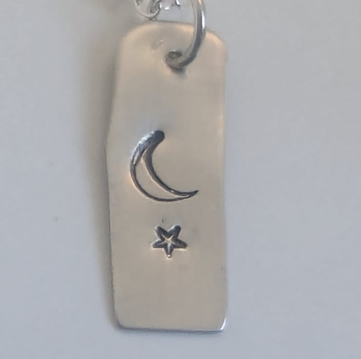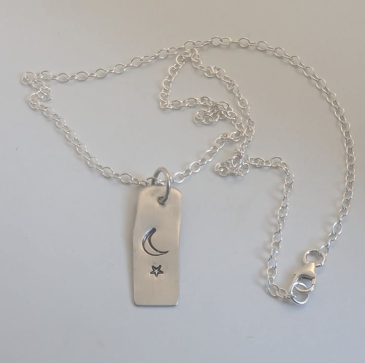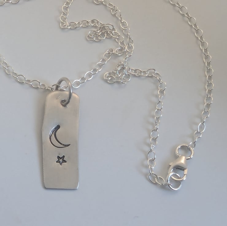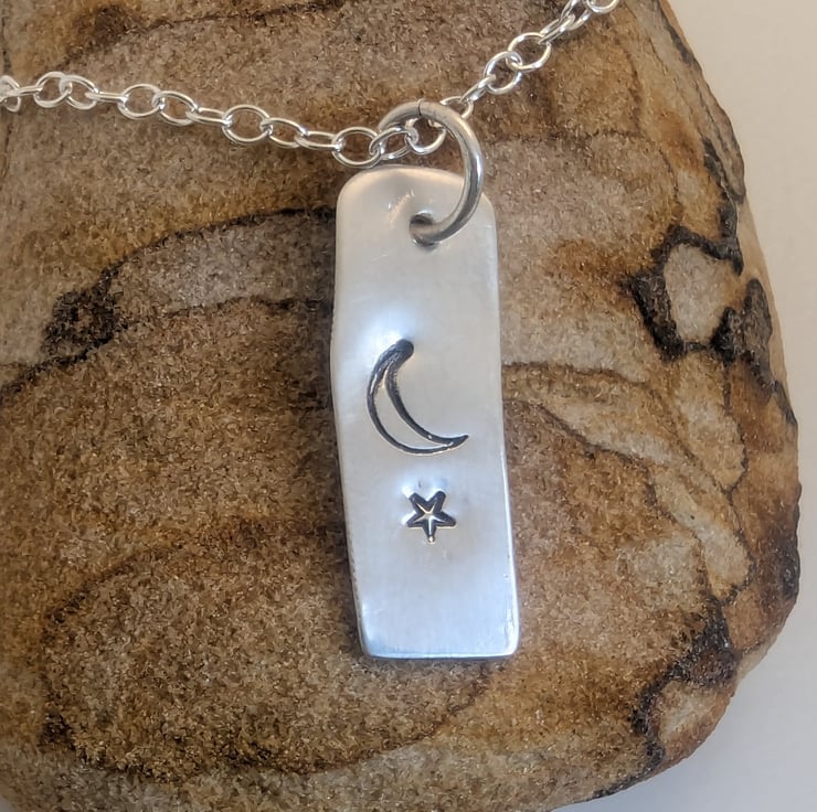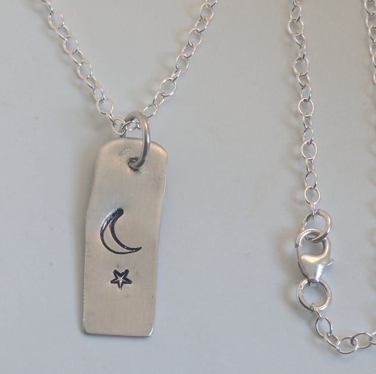 Recycled sterling silver pendant, hand stamped with a crescent moon and star. The pendant measures approximately 2.5cm x 1cm and the chain is around 16.5 inches long.