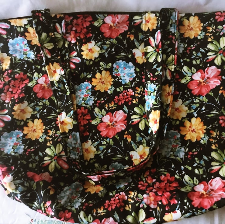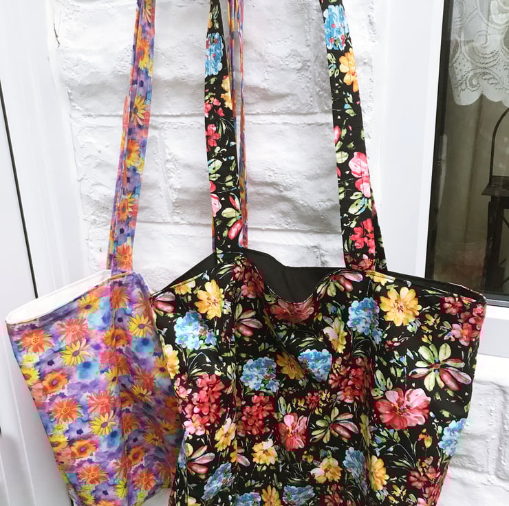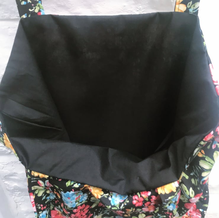 Eco friendly bags handmade from black floral print cotton fabric. Reusable bags to keep plastic bags out of landfill. Easily folded to keep handy