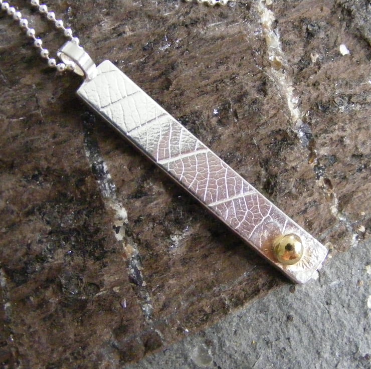 Cut from sterling silver sheet, the pendant has been embossed with autumn leaves, found on one of my late evening walks. This technique has left the unique imprint of the intricate veining and texture of the leaf on the silver.