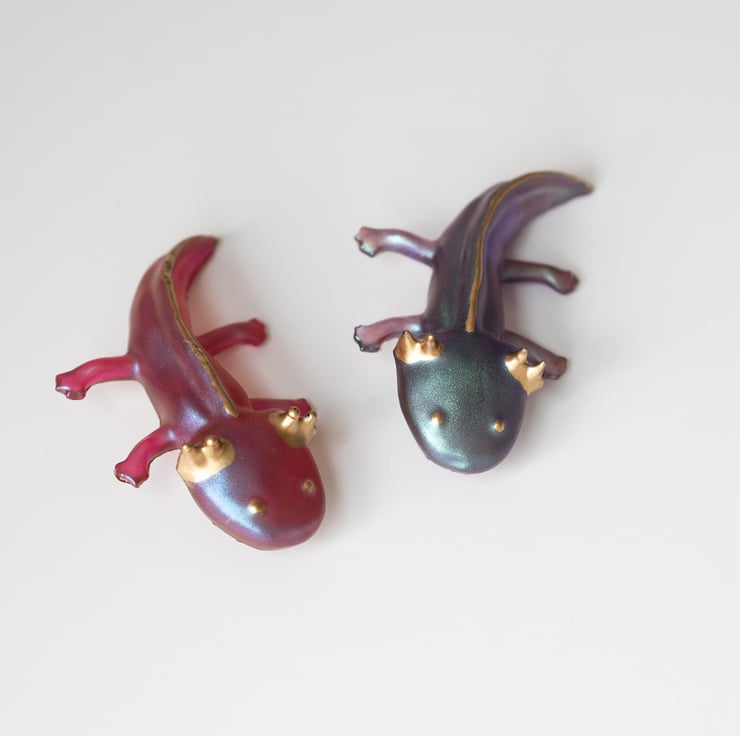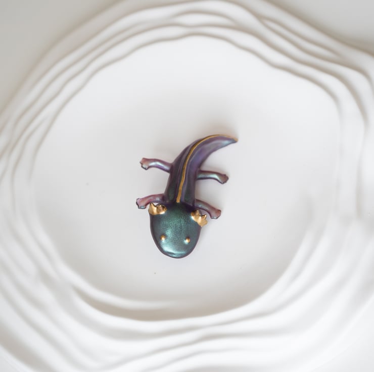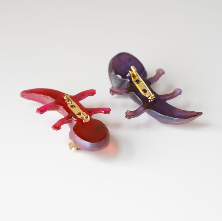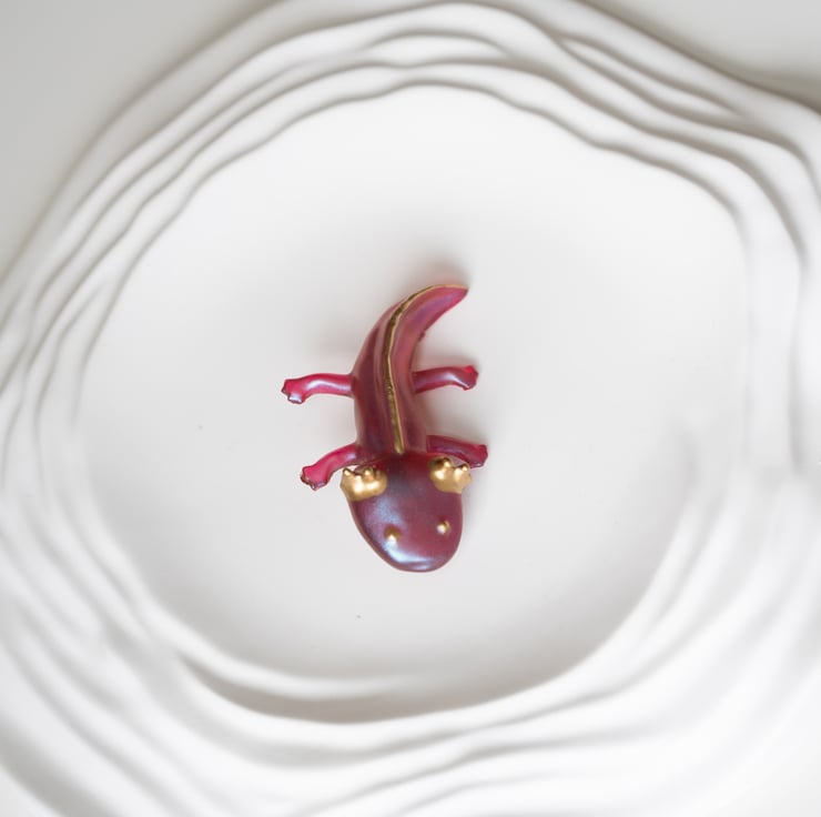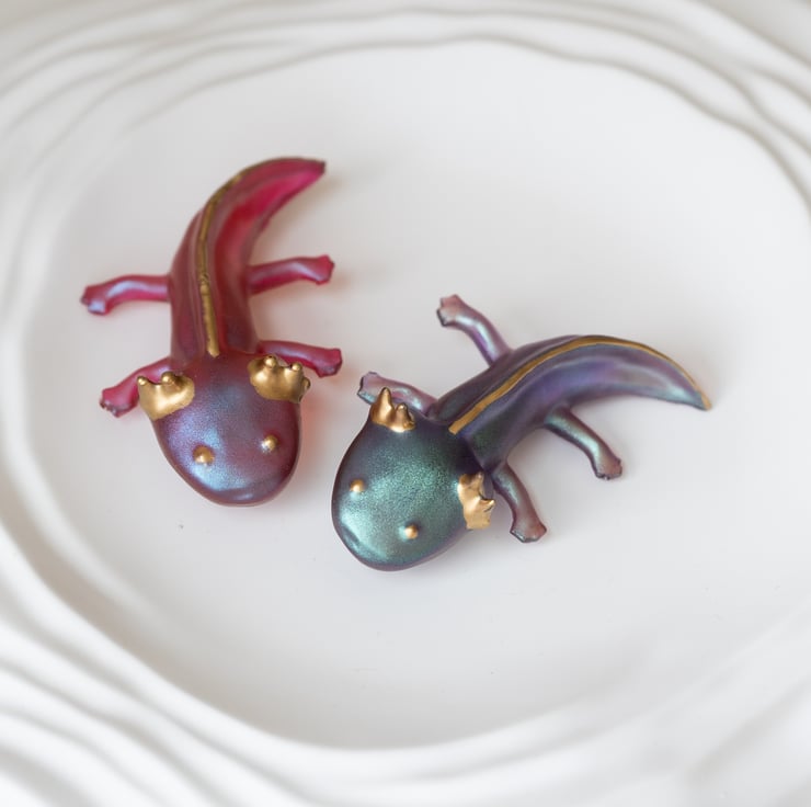 Add a splash of magic and charm to your outfit with this handmade axolotl brooch! Crafted from high-quality resin and hand-painted with shimmering metallic pigments and golden accents, each brooch is a unique little creature full of personality.