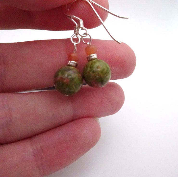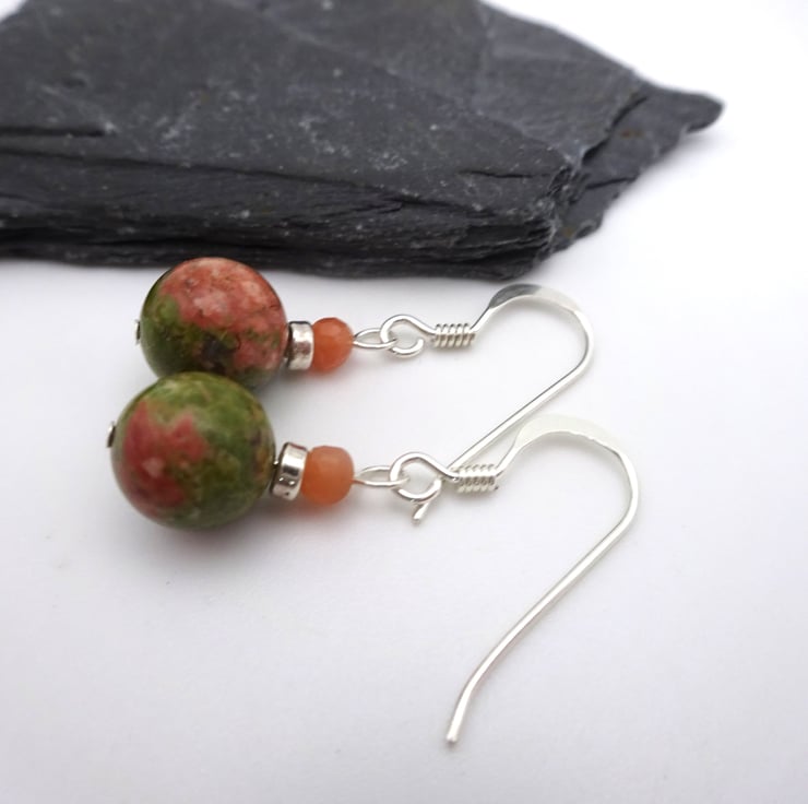 A pair of sterling silver earrings which feature Unakite and peach moonstone gemstone beads.