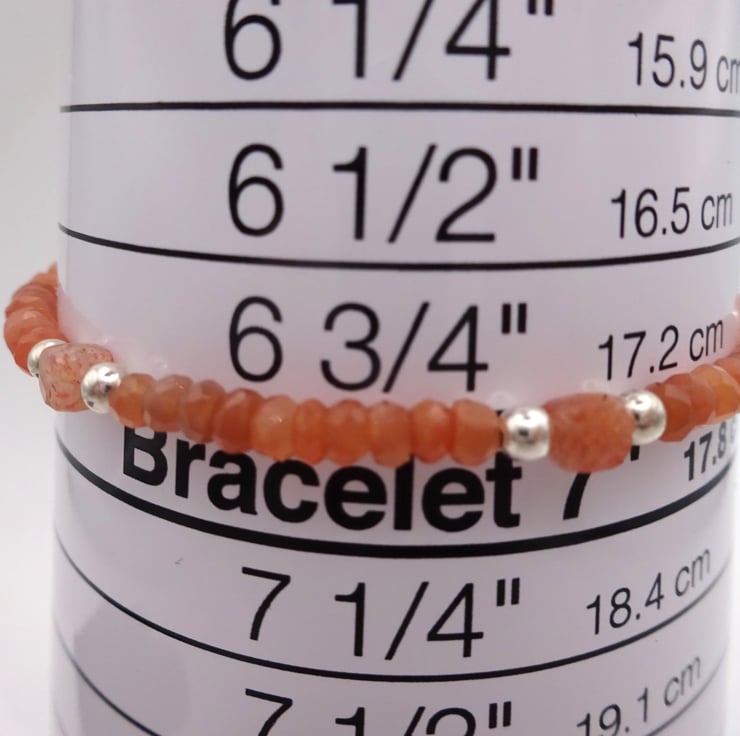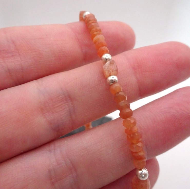 A bracelet made with peach moonstone and sunstone gemstone beads, they have been strung with sterling silver beads.